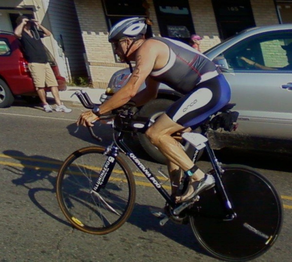Comments: The Aqua bike and relay went with the first wave of women which 29 and under. As our group headed down the ramp I noticed a fog bank coming but didn’t think anything of it. The swim is 600 meters out, 300 meters across, and 600 meters back. No problem, right? 3,2,1 and we are off. Okay, the women’s 20-29 group was freaking nuts! I haven’t had that much contact with a 20 something woman in a long, long time. At one time I might have enjoyed it and I am pretty certain that in some countries I would be married to a couple of those ladies. They were everywhere, going every which direction. At one point I am reaching out for a stroke and a woman swims sidewise into my arm and my arm catches her by the neck and dunks her. I look and I am heading straight for the buoy so it wasn’t my fault but say sorry and take off. I really gunned it at this point to get some clear water. Around the first buoy and try to site on the next one. I barely see it as there is fog rolling it. Next time I try to site on it I can’t see it due to fog so I just sight on the other swimmers. Finally pass buoy #2 and just stay with the group. Finally see buoy #3 and overall my swimming is fairly straight. Hit buoy #3 and make the left turn, can’t see the next buoy and just follow group but you can see that we are swimming towards the sun. At this point the group is thinning out as the faster swimmers get away and the slower swimmers fall behind. Finally come to the turn buoy and a safety boat. Make the turn and this is where the wheels start falling off the train. The people on the boat point the direction we are supposed to go but we can’t see anything and just start swimming. After a few minutes I pull up and the group is spread out everywhere. Several others pull up and I ask the guy next to me “Do you know the way back?”, “Nope”, “anyone know the way?”, “Nope”. Weird feeling to be in the middle of a lake and no clue where shore is. I look up and kind of see where the Sun is and figure swim perpendicular to the Sun and we should hit shore, right? Off I go, I swim for awhile and pull up. Still can’t see anything but I hear women cheering, yelling. I figure that it’s either the swim finish or a Sorority party. At this point, either will do. Keep swimming and finally and see outlines of buildings, I am almost there. Finally see the swim finish and gun it. Finish feeling good, not out of breath, arms not tired. Probably should have pushed harder. Finished 34:11 or 2:17/100meters (4th out of 8) – Good enough for me, was hoping for 2:11 but I am happy with this. It was a great feeling to come out of the water feeling like you could do it again. Definitely should have pushed harder. What would you do differently?: Bring a compass? Swim felt good, bi-lateral breathing worked somewhat but I found I swam off course every time I tried to bi-lat breath and gave up on it. Need to work on that. ![]() Transition 1