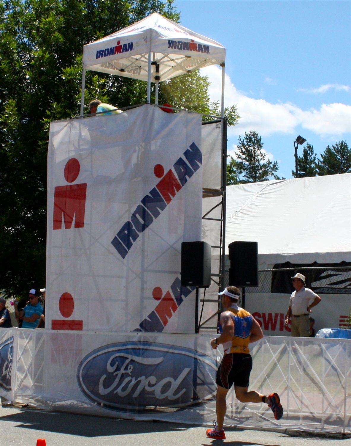 Comments: Getting out of transition was crowded. It's like a mini penalty having an average swim. Spent the better part of the first 20 miles just trying to get by people. The descent on the first loop was crowded but just stayed over near the cones to get by. Second loop there was nobody and basically had free reign. Never went crazy fast with the bit of headwind but hit 51mph on the first and 54mph on the second. There was a bit of wind but nothing bad. The hills aren't really too bad on this course but get hyped up. I just rode the hills around 250 watts mostly and was never in any discomfort. It just felt like an easy long ride and I sort of just zoned out. It seemed to go by pretty quick overall. The second loop was beautiful when the crowding thinned out and I was able to just enjoy the scenery. Got about 2400 cals in. Drank some perform and water along the way supplemented with EFS gel shots and CarboPro. I did adjust my effort level the second loop by quite a bit. Looking back I made a poor judgement on what watts I should have been at. I should have closer to 195 the first loop and then worked towards 200 maybe but I was really riding by feel and not to the numbers really. It did feel real easy and HR is in range. Even though it felt easy it probably cost me and as it started warming up on the second loop I had to make the call to dial it way back. 1st Loop 2hrs 36min - Too fast and I actually didn't really notice because I expected the bears to slow me way down having never ridden the course but they didn't that much. Decided based on knowing the top splits from last year I must be way overdoing it because if I repeated this I would be at the front and I'm not quite that strong so backed way off. Average Watts - 207 Normalized Power - 226 Average Heart Rate - 144 Cadence - 76 2nd Loop 2hrs 49min - Yep. I backed off a lot once I started thinking about the marathon. Kind of rookie mistake that I won't make again. Average watts - 187 Normalized power - 207 Average Heart Rate - 139 Cadence 72 Total Ride Average Watts 196 Normalized Power 217 Average Heart Rate 142 climbing 6,489 ft says the joule The totals look about right but way too lopsided on the loops. If I even rode it then it may have been just right. Overall I don't find this course too difficult in itself but I think the discipline of pacing the bike is easy to put lip service too and still not do properly. I'd imagine lots of people think they are going easy when they aren't because I was getting passed on some hills that I was putting out decent wattage only to fly past most of them later on the flats. Goal was to set myself up to be in a position to put in a good run and I really wasn't too focused on the bike time. I just knew when I saw my lap 1 time that I was screwing up because a 5:12 would have been over my pay grade on a rookie Ironman. Equipment: 2011 Cervelo P2, 50/34 compact w/ 11/23 in the back HED Jet 6 FR front w/ HED Jet 6 FR Powertap SL+ in the back and disc cover What would you do differently?: Start more conservatively. Force myself to slow down. ![]() Transition 2