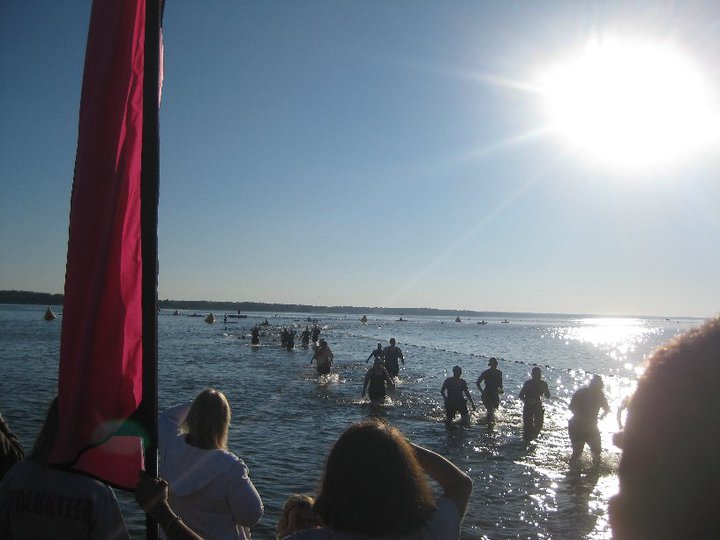 Comments: I LOVED THE SWIM! Loved it. Loved the people swimming into me, loved swimming into other people. It was my very first OWS but it wasn't bad at all (as you can tell by my previous declarations of love). It was a triangle course starting on the left. I started in the middle of my wave and stayed to the right, hugging the buoys. I was passing a lot of women, so I was really happy. When I saw the first cap from the wave before me, I was elated. Sadly, I didn't get into a real groove until I was on the last 300. What would you do differently?: I would've started at the front of the pack. I could've shaved a minute off my time. I would've also begged the organizers NOT to shorten the distance. Yes, I am a freak. ![]() Transition 1