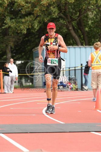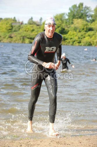 Warm down: I came across the line and was confronted by a race official who said several officials had seen me on the bike course without a helmet. I protested and he went away. I was #196 and I now see that #296 was DQed so I now see what happened. Had water, a bagel, a banana - rested. They had not posted the results after a half-hour so I went home. Cycling that five km home nearly killed me. Event comments: Somersault races are interesting to say the least. At this event there are sprint try, try-a-tri, super sprint, HIM, full iron distance, duathlon version of each, relays, kayak tri, canoe tri, swim-cycles, swim only, and four distances of running races. The overall result is that you never know where you are in relation to the others in your event. As time went on there were fewer and fewer people on the course and as a result I felt that I was way behind. It turned out I was evenly in the middle of the HIM pack and the dwindling racers was due to the shorter distances finishing. The other problem with this race is the fan support. Transition is set up in a stadium but there is generally no one there. Of course there is no entertainment or post-race events like at other races so it wouldn´t be very exciting to spend the day there anyways. There are maybe about 100 people lining the bike course (I liked the guys with cowbells on the one hill on the bike course - very Tour de France feeling!!). I think Ottawa is just not a spectator town. Fortunately it is a participating town and there are races here every weekend all summer long. My family came out to a spot on the bike course 200 m from my house, watched for two of my laps, then left. My sister-in-law came in from Stittsville to watch which was really nice. This was my first Half-Iron and I´m very happy with my time. I cam in under six hours which was my outside goal, and broke my swim goal, made my bike time goal. I see a glimmer of hope as well - if I had been better trained on the bike and run I know I could have made my run goal in spite of the wind. That, in this race, would have been a potential fourth place in my age group. It is nice after years of training to finally see a potential for decent placing in a race. I´m looking forward to next season - should be fun!! Last updated: 2010-09-07 12:00 AM