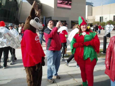 I went for a 10 pace and just held it steady. This race is a FUN race. The spectator support is awesome. We ran through a ritzi neighborhood of huge beautiful houses all decked out for Christmas. There were people outside in their bathrobes drinking coffee and cheering us on. There was a man spinning a ball on his finger with yet another ball spinning on top of that, a girl in a costume on stilts, and several other costumed characters including the "Eat More Chicken" cow! Some of the runners were in Christmas costumes dressed as elves, reindeer, and even a full santa costume.