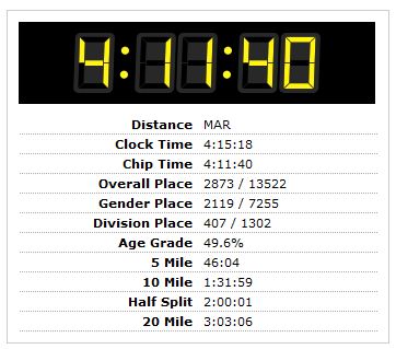 Comments: This was my first marathon. Going into this race I had three goals (listed in increasing difficulty).....finish upright, finish without walking, and the dream was to finish under 4hrs. I was able to get in two 20 mile training runs during my plan, but the first of those I had to stop at 19.5 due to cramping. This really shook my confidence and made me start to question myself. The second 20 mile training run I was able to complete without stopping or walking so I felt pretty good. Lots of snow this winter, so the second 20miler was in 2-3inches of snow. Not sure if that was a bad decision to run in snow, but wanted to get it in. So I felt good about the training and was ready for the final test. The start was just like the online videos....extravagant with fireworks and high energy music. Our start group was third behind the wheelchair athletes and corral A group. The start gate had flame torches on the structure that actually warmed the air as we ran through the gate....felt good, but the adrenaline was flowing anyway. Before we knew it we were running in the dark with spectators lining the left side of the road. Tried to keep an eye out for my Dad but there was no way was he going to recognize me in the group. It was really cool once we circled around and entered Epcot near mile 2 I think, there were so many people crammed into the monorail station. Through miles 1 and 2, I noticed that I had started at a slower pace than I really wanted. I figured that I would play it conservative and make the time back slowly. During my training, the only really tough runs for me were the ones that I started off at a quicker pace than I intended. So I intentionally started at a slower pace and was only really about 30sec off for the first 1.5 miles. Going past the Aztec pyramid in Epcot (Mexico), I took off my long sleeve shirt and "donated" it to the course. We finished running through Epcot and circled back to the start area around mile 4. I was into my rhythem now and was nailing my pace each mile. I have to say that the volunteers for this race were exceptional. The water/aid stations were very well organized, with distribution on both right and left sides of the road. Also, the medical stations were not mixed in with the water/aid stations (this really opened things up a bit). Between mile 8 or 9 the sun was starting to rise, with blaze pink colors against the dark blue sky...this was just before entering the Magic Kingdom. We continued on past the Contemporary and down under the lake, then back up as this was the first slight incline of the course. Past the space mountain then on to Main Street....which surprised me with the number of spectators. I dont know what I looked like, but I felt like a little kid with a smile from ear to ear running through this section (high fiving strangers and all). I had to really back off the pace as I looked at the Garmin and noticed I was close to 8min pace. Then it was onto the castle .......they sounded the horns just as we ran underneath. The course wound back towards splash mountain then out the back service entrance of Magic Kingdom. Nearing the halfway point I noticed a hot air ballon in the median of the road. This was just at the 1/2 way point and feeling good still. A quick check of the pace and I was right on plan to break 4 hours - good mojo. The next section of the course between Magic Kingdom and Animal Kingdom was rather dull, but the volunteers did a great job. We ran past the recycle center and water treatment and onto the Animal Kingdom. I have to say that I didnt anticipate the many turns in the course through this section and really had to concentrate to run the tangents. I remember seeing expedition Everest then it seemed as though we were out the back of the park. I started to feel slight twinges in the quads as we ran across the bridge spanning World Drive as we made our way to the ESPN area. It was a fair incline and this was the first section I noticed several folks walking. I actually felt good, but to be safe took an additional eduralyte tablet. We hit the 180degree turn near ESPN and I noticed how stiff I was getting...this is about 20.5 into the race. I clearly remember thinking that every step past this point was going to be a distance PR, which was motivating. But I also realized that my goal of under 4hrs was not going to happen and was OK with that. I could feel my pace was starting to slow and mentally I was starting to get tired. Every aid station I was taking both water and Powerade. Finished up my last gel at mile 22 and knew it was going to be a fight to the end. We entered the MGM park and this is where it hit me hard. For some reason, when we ran through the artists tunnel I started seeing large spots in my peripheral. I dont know why, other than it was really dark with my shades on in the tunnel, so I took them off to see if it would get better. This kind of scared me a bit....so I backed off a bit more. I was still jogging at this point and made it through the MGM back lot city and up through the main area of MGM park. It was good to have the support as I needed it badly....the wheels were starting to come off. At about mile 24, before we hit the Boardwalk, my quads decided it was enough and simultaneously cramped. I slowed to a walk for the first time, a bit disapointed and in pain. I was able to walk/run through Boardwalk and into Epcot, but it was not pretty. Once into Epcot I was able to power through the last 0.5miles running. I could hear the finish before I could see it, made the 90degree left turn and was glad to see the grandstands full of spectators. Crossed the finish and let it all soak in.....a huge smile and double fist pump.........goal accomplished........finished upright, had fun. What would you do differently?: I believe adding at least one 22-23 mile training run would have allowed me to finish without walking, but I cant be sure. Ultimately I feel that I need more volume in my training to br