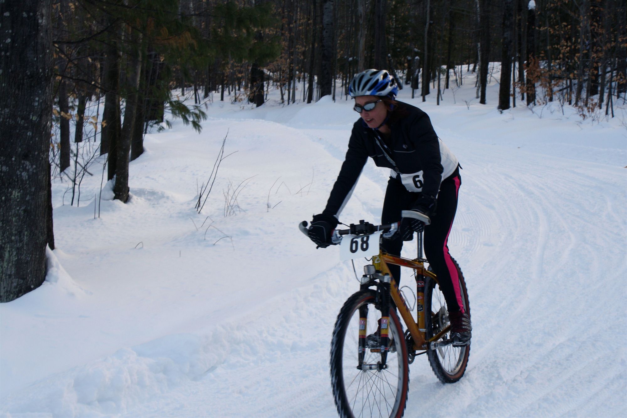 Comments: This seemed to be my strongest segment. I really love the bike! Since I was at the back of the pack from the run, everyone had churned the snow in spots, making it soft and ripe for wiping out. The hard pack was awesome to ride and I actually got a little speed (notice I said little) I had taken a Cyclocross-clinic earlier in the fall and all the techniques that I learned there really came into play here. I got good and jumping off the bike and running with it and jumping back on all in a fluid motion so I didn't lose too much time. And I never fell! I did get stuck in one particularly soft section and had to walk to the downhill portion to get back on the bike. I tend to stand when going up hill and hover over the seat on the downhill’s but I had to keep telling myself to keep my ass on the seat lest my back wheel just spin and spin and spin! 2 miles seemed to stretch on forever! By the time I got back to the T-zone my legs were toast! What would you do differently?: Get snow tires for the bike and ride a lot more on snow and DRINK! ![]() Transition 2