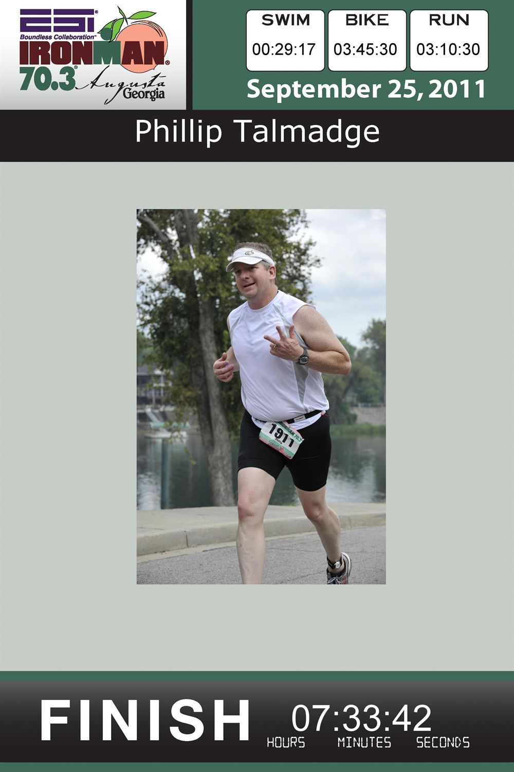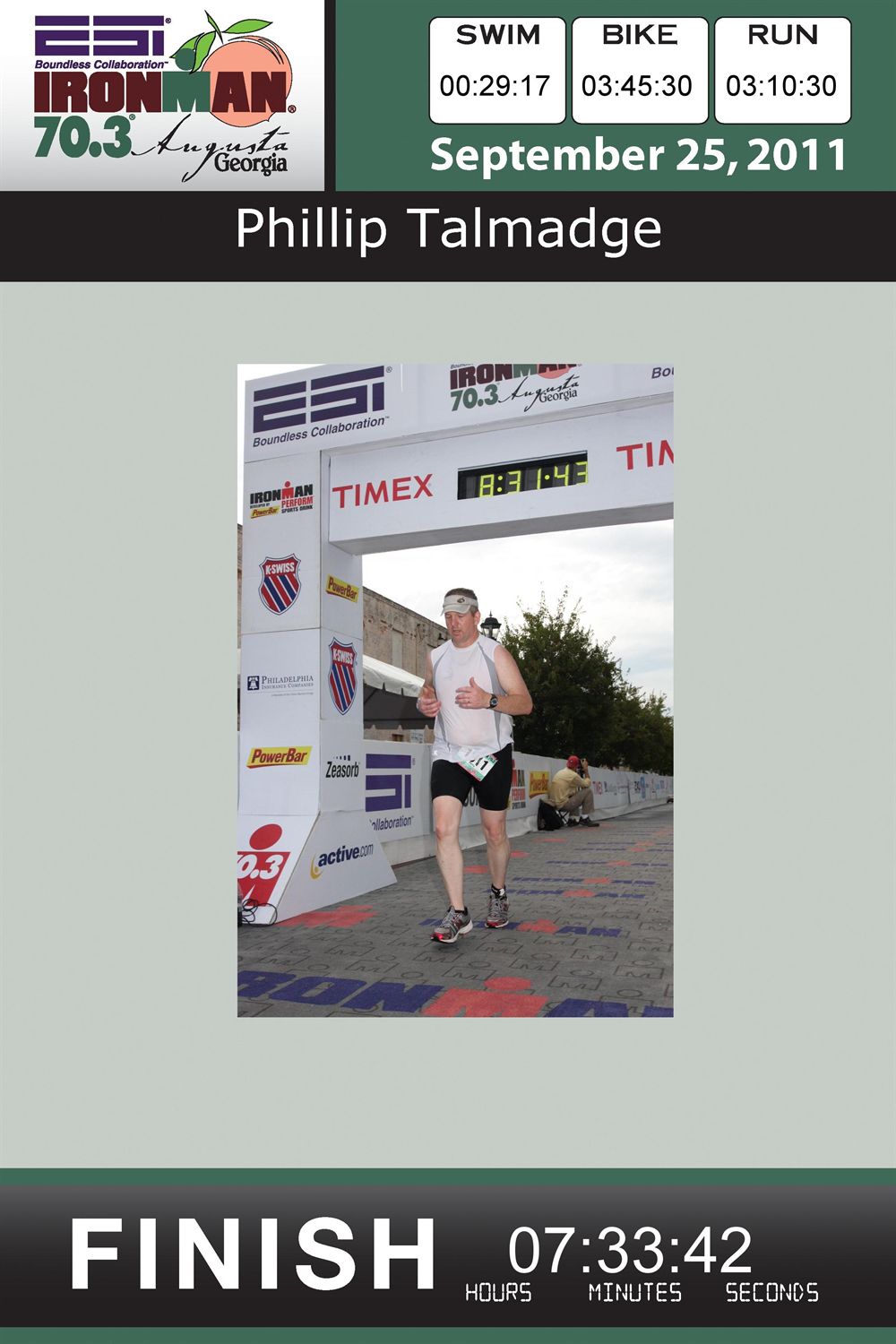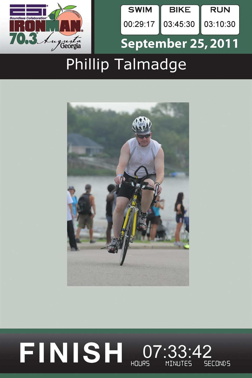 Warm down: Stand very still and walk slowly to food tent. What limited your ability to perform faster: I got too hot and did not train enough. Event comments: This was my first IM and only my second triathlon. I did an Olympic distance the month before this race. I was super excited that I finished and all the folks on the race were just great (I got to see almost everyone as they passed me on the ride and have grown to dislike the phrase "on your left" very much). There was one protester holding a sign and saying go home and I was amazed he felt that strongly to stand out front and do that on a Sunday morning. His neighbors made up for him and all the folks who took the time to get out and cheer were super. Getting there, going through registration, and setting up were all over whelming at times. There were more fit people than I have ever seen, they all looked like they knew what they were doing, and were all fitter than me. On race morning I settled down and became resigned to finish. I had a great time and was real glad I was able to bring my dad with me (he missed the start and finish) and I enjoyed spending the time before and after the race together. Last updated: 2011-03-28 12:00 AM