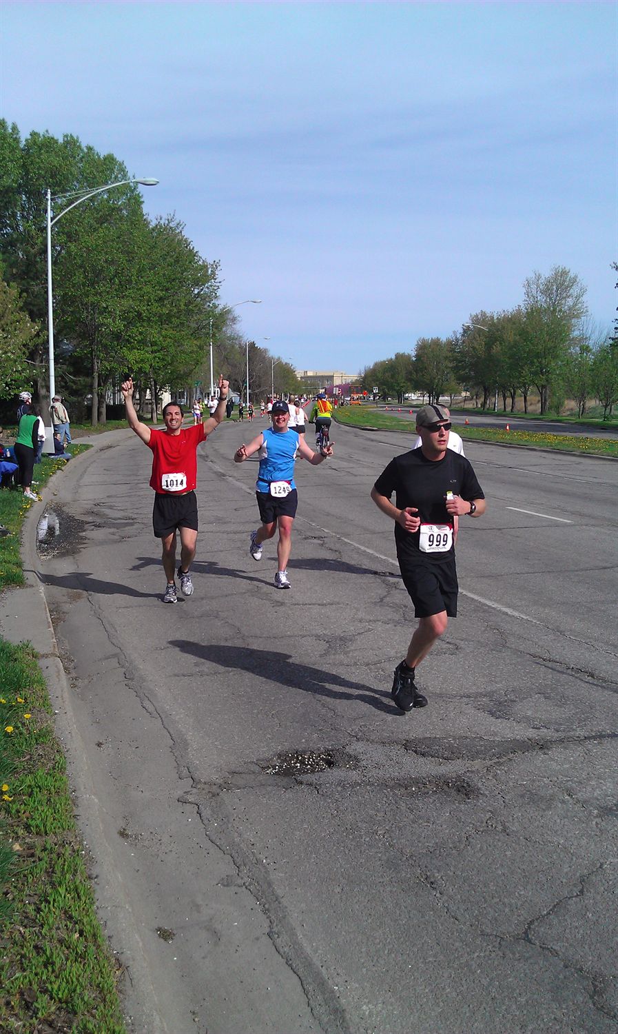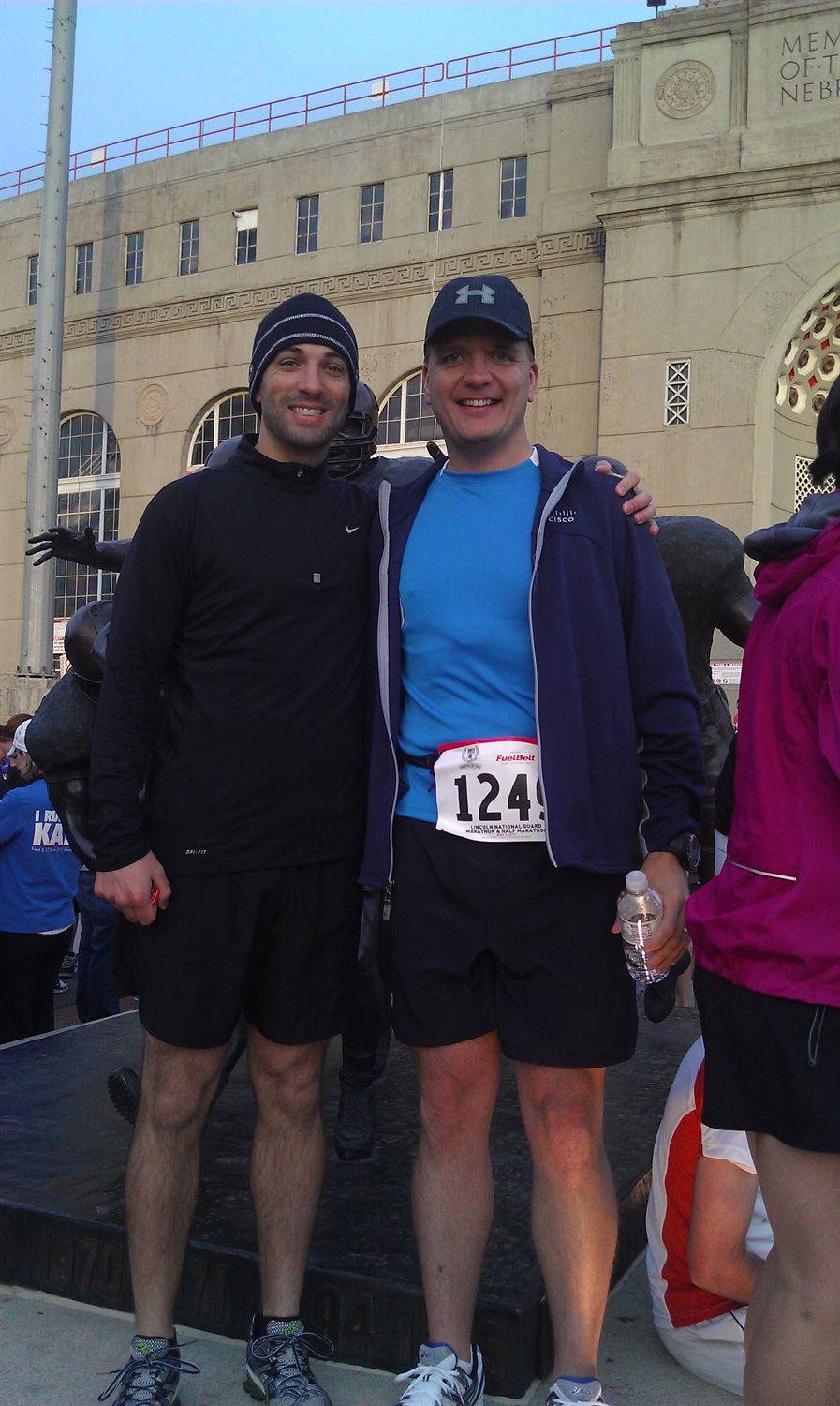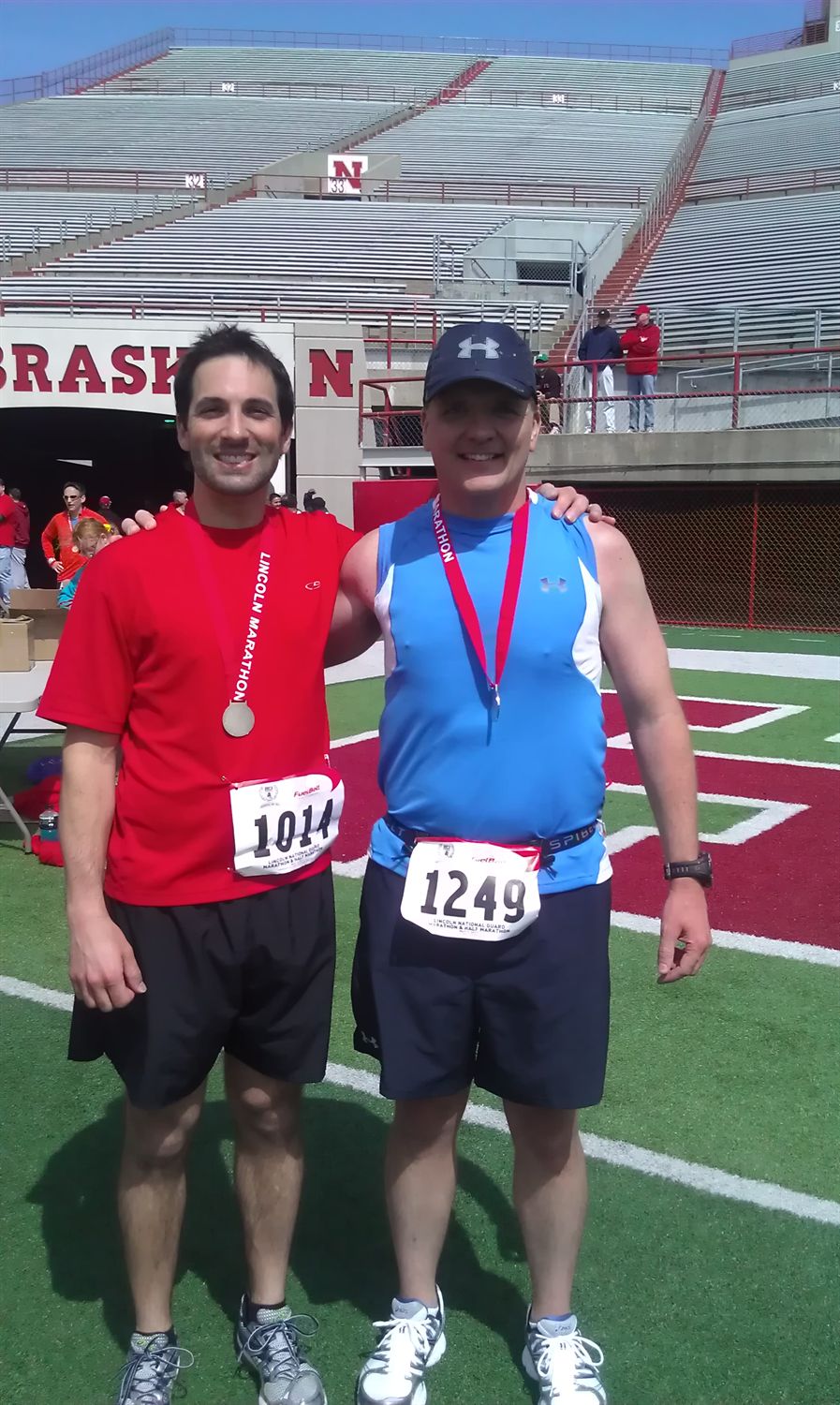 Little background for everyone. In August of last year I weighed 225 lbs. and couldn't run to the mailbox and back without coughing up blood. My neighbor Scott invited me to watch him compete in a Triathlon on Aug 1st and it was the most inspirational thing I've ever experienced. I told him that I was going to do the Tri with him next year and we've been working out 6 to 7 days a week ever since. Back in December, I told Scott I wanted to do the full marathon in Lincoln and he said I was crazy and that he hadn't even done one before. I signed up and shortly afterwards he did as well and said if I could do it he could do it.