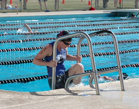 Waited...waited...waited. We didn't start lining up to the pool until around 9am. It was already hot out. I was roasting and just wanted to get in the pool. I sat there watching all the 100s go by...then the 200s (my number was 303). I met a fellow Tucson Tri Girl, Janie, there and talked to her a bit. This was her first tri.