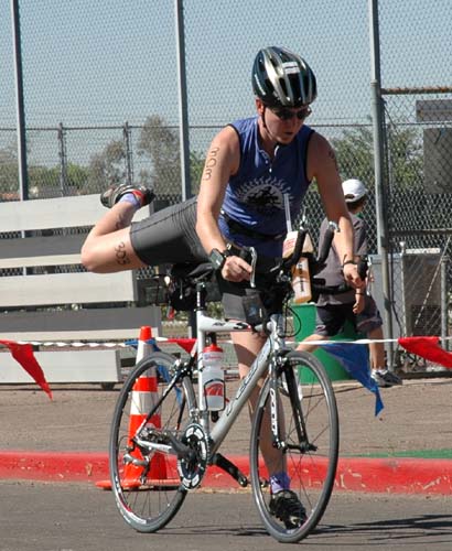 Comments: So the chick that passed me in the pool parks it on the exit of the pool. I said "excuse me" as I was booking and on my way to T1. She then decides she should start running. I finally got around her and got into T1. Oh, and my HRM strap must've loosened or something because it was halfway down my chest. I had to struggle to get it back up where it belonged, as I really wanted to get HR data for the bike and run. Come to think of it, this was the first time I had swam with a HRM strap on. Oops. They screwed up the setup of the transition area. Usually it's 1-way traffic. But they set it up to swimmers coming in and bikers going out were using the same entrance. So you had to be careful of traffic. I ran to my pit space (sorry...motorcycle racer in me) and got everything on. I had to make a concious effort to put my number belt on, as this group required it on the bike. Most of the other sprints I've done don't. Got my bike and ran out of T1. There was a gal on a MTB right in front of me. She stopped to get on her bike, but I kept running. As soon as I was up to speed I made one final push with my left foot and did my flying cyclocross mount onto the bike. Zac got a good pic of it this time. What would you do differently?: Tighten HRM strap. T1 wasn't as fast as it usually is, but I can fix that over the season. That was the point of doing this race...figure stuff like that out again. ![]() Bike