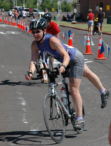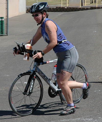 Comments: The course wound around the parking lot with a bunch of strange chicanes (again...motorcycle racer talk). I was stuck behind the girl on the mountain bike. She was swerving and had some unpredictable lines in the corners. I was busy getting myself re-dressed trying to get my HRM strap up under my swim top. Got that where it belonged and got my number bib on right. Now that I was dressed I could concentrate on biking. As soon as we got out of the parking lot and onto a street I shifted gears and passed the girl on the MTB. I had to cross the cones to do it, as there wasn't much room. I had no idea where the course went, other than I had to do 3 laps. For the first lap I kept it in an easy gear and spun my legs fast. I found out this is why they want you to keep a high cadence. Works out pretty good. I got settled and kept spinning along, and soon I was passing people on the bike. Sure enough, each lap we had to go back in and do the parking lot section with the strange chicanes. On the 2nd loop I used this time to get my gel opened and get ready to eat. Then after I got out of the parking lot I ate half the gel and got quite a bit of water down. One thing I messed up was putting Gatorade in my aerobottle instead of water. Definitely need water up front next time. So this girl in a blue shirt decides to pass me while I'm eating, as does another girl. No biggie, I figured after I was done I'd catch them. Sure enough, I was able to get on a straight section and back into my aerobars and passed both of them. They both sped up trying to catch me, but I had already shifted another gear and was making a gap. On the 2nd loop I saw a girl lying on the ground in one of the corners. She lost it big time. The corners were a bit rough, so on those I stood up a bit and moved my weight back. On the smooth corners I was able to pedal through pretty hard, and gained a lot of time on folks that way. On my 3rd loop I finished my gel, and got more water down. I sped up on this loop, trying to negative split the bike. Towards the end I passed a guy on a road bike who was wearing a red shirt. His bike sounded awful! Something in the drivetrain was griding bad. So he then passes me back and slows down as we head into the parking lot. I knew I'd be able to dismount off the bike way faster than him, so I sped up to give myself room. What would you do differently?: Water in the aerobottle, Gatorade in the bike bottle. ![]() Transition 2