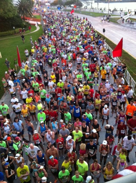 Comments: When I signed up for this race I set myself a goal: 1:25, and I stuck to it until last Wednesday, when I had the brilliant idea to change my goal pace. This was done based on a couple of factors. First, I have been running at a faster pace in the last month or so, and I feel I have improved considerably. Based on the McMillan calculator, using the first 5k in a duathlon I did last month, I should be able to run the 15k at a 8:38 pace, so I thought I would be fine going for 8:30. The other factor was THE BET! Here is how this came about, I have a co-worker who is 15 years younger than me and a serious runner. When we talked about Gasparilla and about the goal I had of 1:25, the conversation ended up with him setting up that same goal for his Half Marathon. Therefore, we created the following bet, if he was able to go under 1:25, we would both sign up for a race of his choosing, if he did not break 1:25 AND was slower than my 15k, we would both do a race of my choosing, which I already told him is the St. Anthony's triathlon on April 29. He hates swimming by the way (as do 33% of triathletes...I know, I made this number up ;) ) Anyway, I felt like he had gotten the short end of the stick, so I told him Wednesday that I was going to shoot for 1:20, and if I blew up, then he would probably have more time for his Half. I still believe I could have done the race at a 8:30 pace, if the weather had not been as brutal as it was! And this was my big mistake. Upon seeing it was going to be hot and sunny, I should have gone back to my 9:00 pace and if I had anything left, increase the pace towards the end. But I am not that smart! My ego won the day and I lined up with the 8:30 group :( We started at 7:05 am and at that point it was hot but not too bad. In the first two miles we had to deal with a LOT of traffic, since there was almost 5,000 people racing. I still don't understand why people can't line up according to their pace though. When you have someone that started way up in front walking leisurely in the first half mile and having people having to run around them, it is really annoying! The traffic also results in the 8:30 pace being a little harder than normal, since you have to continuously speed up and brake, change directions, etc. By the third mile traffic was not an issue anymore, but I started feeling the heat already, and with the HR at 174, things did not look good. In mile 4 I lost the pace group, I could still see them since they were 15 seconds ahead of me, but I knew I was in trouble. Mile 6 I slowed down some more and it was time to face reality, this was going south fast, I walked through the water station to see if that helped, but it did not. Shortly after that I decided it was time to change my strategy, I decided to walk until my HR went down to a more manageable level, so I did this for a bit, and when I started running again I did so at a slower pace. Mile 7 was the slowest one, and I did two walk breaks. During mile 8 I started feeling a little better, but still walked for a little bit (shorter though). Then walked the water station right before the mile marker and decided to try to give it all in the last 1.3 miles. Looking at my Garmin I knew that if I could go at 9:00 pace for the last 1.3 miles I would come in right around 1:25. Achieving my original goal, and not giving my rival in the bet any extra time tomorrow in his Half Marathon, seemed like a pretty good outcome after the suffering earlier in the race. So I went into the hurt locker and took off. How crazy is it that I came in at exactly 1:25:00?! I also learned something about me. My max HR based on age is 183, and I have never gone above that. Today in the last 0.3 miles of the race, I reached 186. That shows how much I pushed in this race, even in a bad situation, and I am kind of proud about that :) What would you do differently?: Adapt my strategy according to the conditions. I should have gone with the 9:00 pace group. I probably would have ended slightly faster than I did and with much less pain.  Post race Warm down: When I crossed the finish line I could barely walk. I kept moving, but it was hard to will my legs to obey. I drank 3 bottles of water in the chute, and had a banana, a smoothie and some Gatorade. Met with a friend from work, who finished 12 minutes before me, but also had a tough time and ended up with a time 10 minutes slower than expected, and then we walked towards the parking lot at work. I did some slight stretching and drove home. After that I stretched some more and took a long shower and did some more stretching. Then slept for about 40 minutes and went for a massage. What limited your ability to perform faster: The heat and humidity. Event comments: Putting together a race this size is impressive in terms of logistics. Besides the 5,000 people in the 15k, there were 12,000 running the 5k right after that. The organization was impressive, the medals were very nice and I also liked the t-shirts. The thing they missed was better food at the finish line. The choices were extremely limited. In previous years, the restaurant Columbia has Paella, this year they did lentil soup, which I tried and was really unappetizing, especially at 8:30 am :) Last updated: 2011-11-01  12:00 AM |