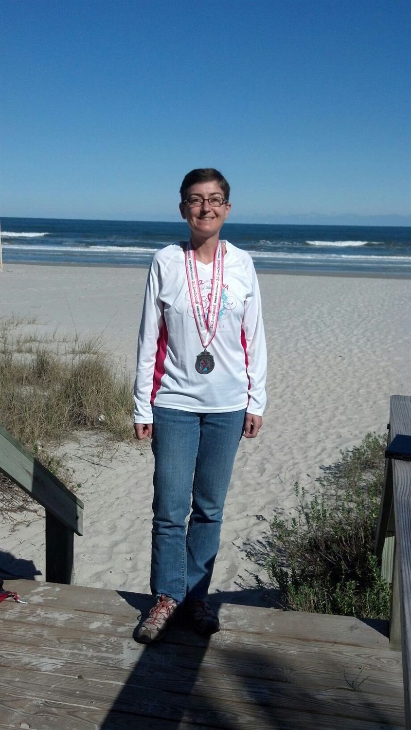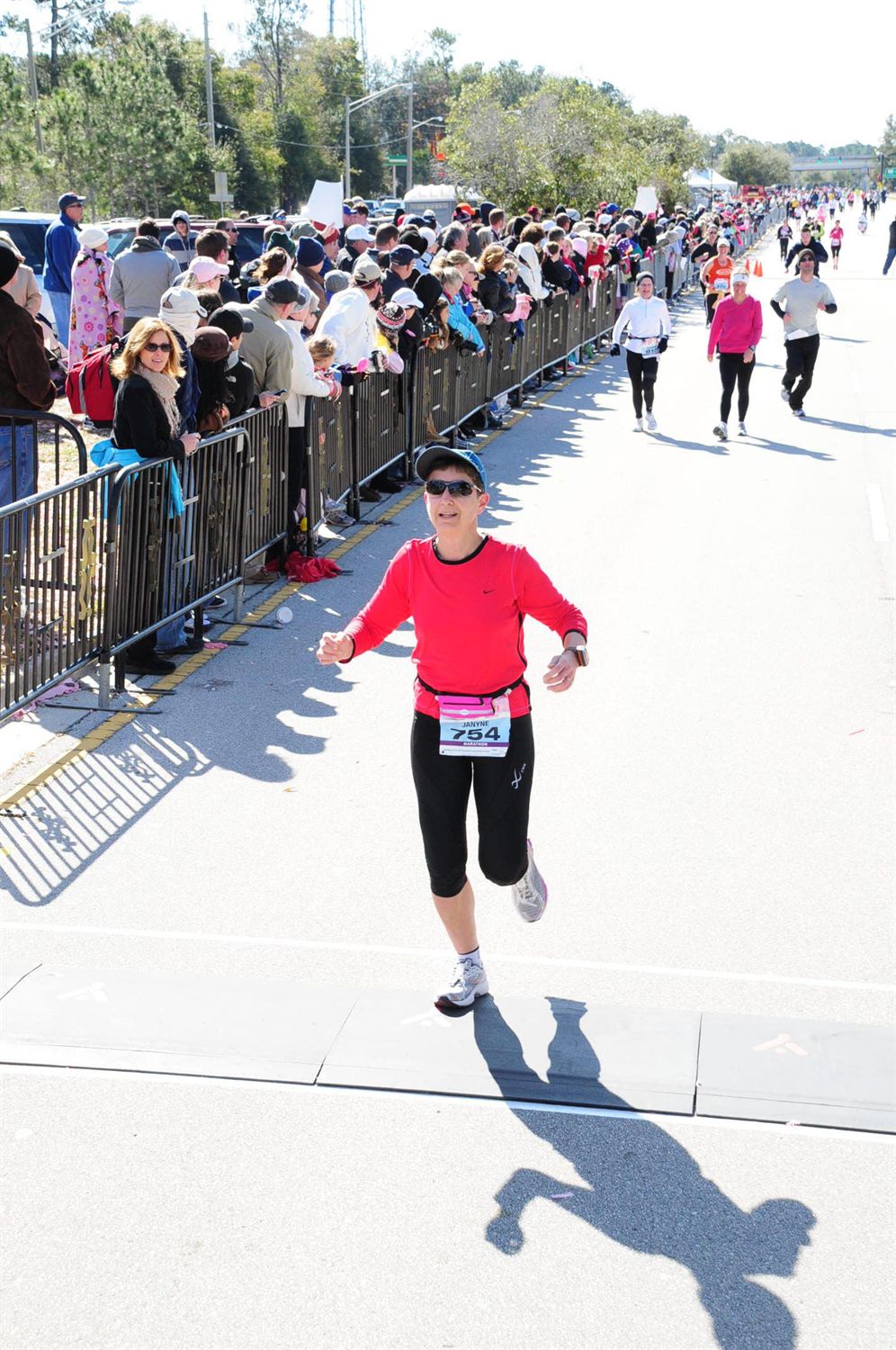 Course: The course flat except for bridge over intracoastal waterway. Almost immediately after leaving the Mayo Clinic, the course went over the intracoastal waterway. After about three miles on an expressway (closed to traffic, of course!) we started winding through Jacksonville's beaches. From about mile 5 to 8 we ran on the sand on the beach. The organizers created a temporary walkway over the soft sand to get runners on and off the beach. There was tons of crowd support along the course.