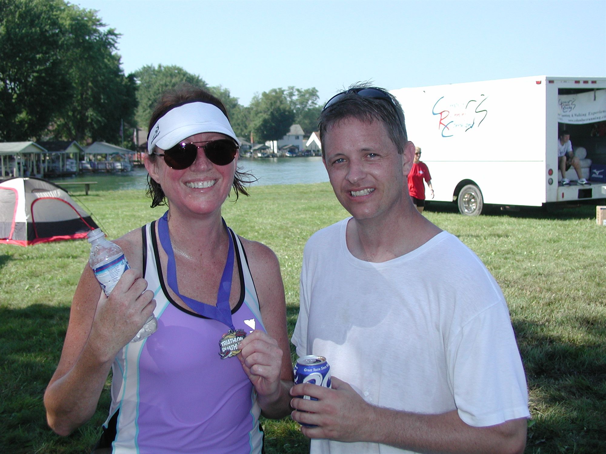 Watermellon -- my favorite part of the post race. Its the only thing I eat and so really does the job. Then I headed for the lake and took a short swim to try to get my body temp down -- I overheated to the point that I got goosebumps/chills/started shaking.