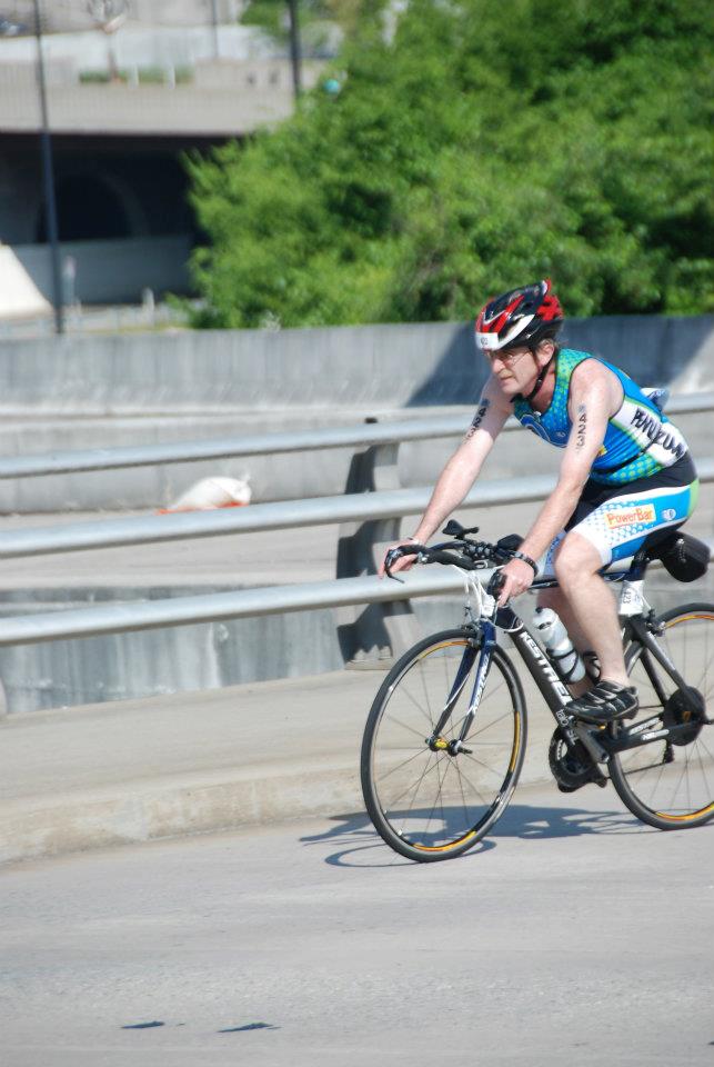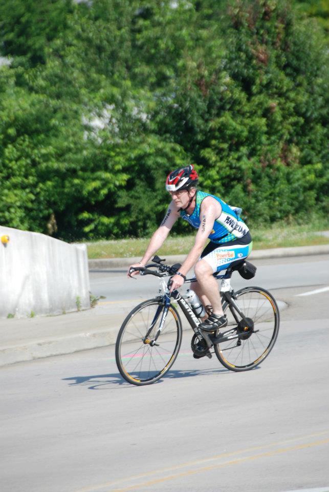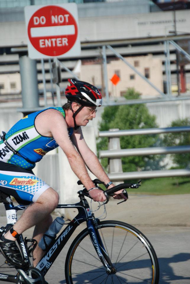 Drove down on Friday. Got a late start as I had to change the oil and do some laundry before hitting the road. 10 hour drive got my into Knoxville at around 8 pm. Still had enough sunlight to go for a shakedown jog on the course, getting back in the dark. Spent Saturday regestring, geting my bike a pre race tune up, and then heading down to meet my teammmates for both Team Fight (Ulman Cancer Fund) and Team Rev 3. Got thre sets of uniforms, but they actually fit this year. Then we did the Tri Slide Lube pit for the practice swim. I greased up a lot of folks and got to talk to a lot of nice folks from newbies to Matty Reed and Cam Dye and a bunch of other pros (Most of them had an Austrailian accent, which was a tip off). Then I got my swim in and then headed back to the room for a nap. Got up and hit Tomato Heads for a Team get together with some of my Rev 3 teammates and then called home and turned in. Sunday got up relatively late since bike was already checked in, got dressed and headed down to Transition, set up my area, lubed up with the last of my Trislide from yesterday, got the wetsuit on (after starting to put it on backwards but I caught it after one leg.) Then got ustered out of transition. Had a power gel (strawberry bannana when I got up, before I left the room, and just before heading to the swim start to top off, and water to wash it down.