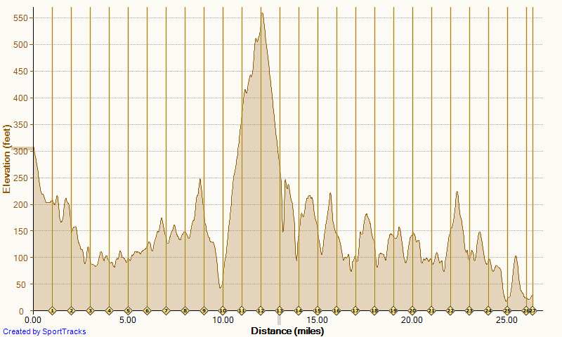 The day before the race, we drove the course and soon realized this was not a course with a few untimely hills. It was non-stop up and down with a lot of those hills quite steep. I quickly changed my mindset from PR to "survive" as I had really under-estimated the amount of hills (I expected the size of the hills, just not that many). The view as we drove the course was UNBELIEVABLE. Got a taste of what the wind might be like when I got out to use a porta potty on Hurricane point...thought the porta potty was going to blow over! Holy Crap!