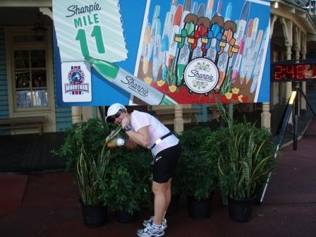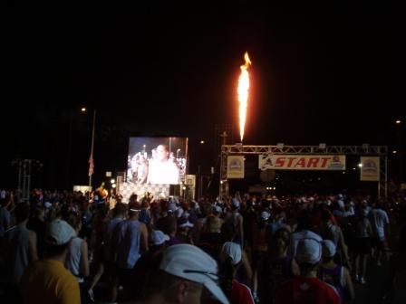 Woke up at the ungodly hour of 3:30 (again) and quickly got dressed to catch the magical race shuttle to the start. Last bus picks up at about 4 a.m. or so. Refilled our Mickey travel mug full of coffee in the hotel food court then took the bus over and did some light stretching before getting coraled (again) to the starting gates (MOOOOOO!).