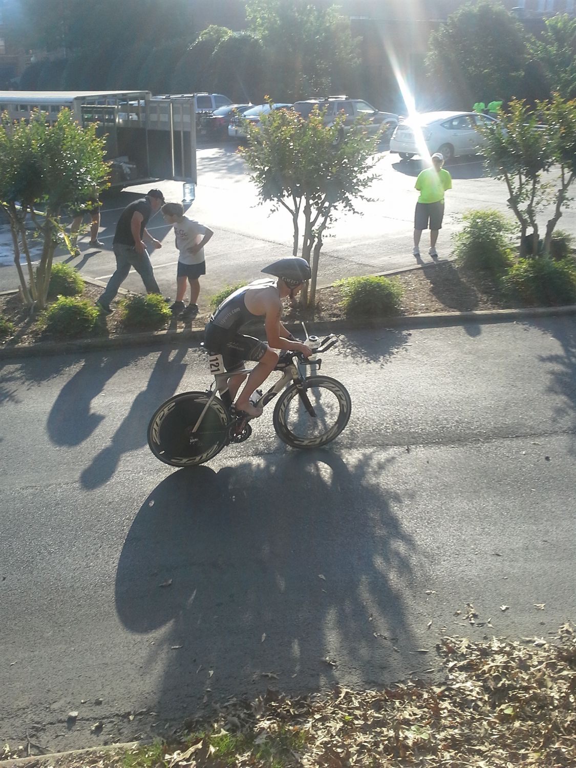 Comments: I am not going to lie, this course was tougher than I thought it would be. Much more climbing than I was expecting, but still a good course. First 3-4 miles was a series of false flats. Keep on the pedals, and you can still click off the miles at 25 mph. After the 3-4 miles, the rollers start. I was warned that there was one climb on the course was at mile 10. That was actually correct. The hill slowly climbs to the left, and then gets steeper back to the right. After you top it, it was flat and a right turn, and then zoom down the hills with a few rollers before the turn around. At this point I started to count, and knew I was in the top 5-6 already including the relay teams position wise. However, the glory of starting in the very back is that I knew that I was already in the top 3 based on the start time difference. Made the turn, and started climbing my way out of that hole. Worked my way back to the top of the climb at mile 10, and then zoomed down it. At the bottom of the hill (basically) is where the return differs from the out. Instead of hanging a right, you keep straight. The rest of the course was a series of rollers. I had one guy in sight that I was chasing down, and he was moving. It took me several, several miles to get him reeled in. Finally caught him, and as I passed I said "strong bike". I am not even sure if he looked at me, but I know he did not say a word. I am not sure if I need to stop that, because it comes across as being an azzhole (since I am passing)? I was being serious that he was a strong biker, but perhaps my timing is wrong doing so on the course? Nonetheless, nothing eventful happened after that, but the one thing I wanted to note was the black magic of miles 21-23. I know for a fact that it appeared that I was going down hill, but I was slowing down. I was like WTF is going on here. I was hammering and barely pushing 22 mph, which really struck me as odd since there was also no wind that I could tell. With one mile left you hang a right onto the main street where they had an entire lane coned off which was really cool. Basically flat, with one very small up and over the river before you hung a right into the parking lot to dismount. What would you do differently?: Since it took me a few days to finish up this report, it has become clear to me that the reason I was lacking that "additional gear" was that I was one day away from having a complete breakdown and being sick. Wheels fell of the bus on Monday, so I am sure that was the root cause. Nothing you can do about that. ![]() Transition 2