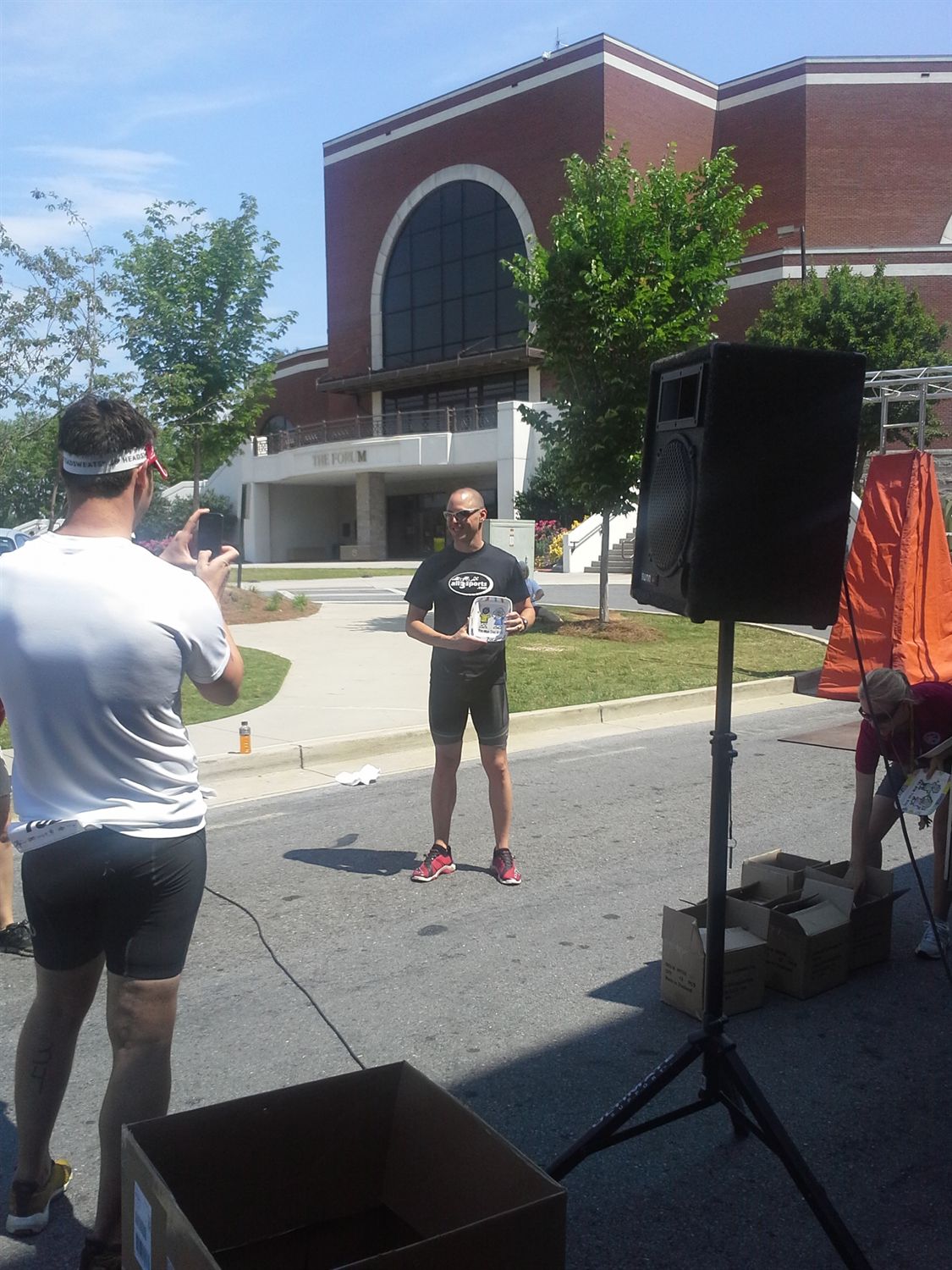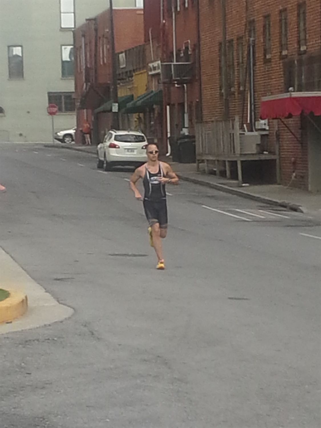 Comments: Exiting transition you go down a sloped bank to a concrete running path. I did my best not to bust my azz on that down hill, and when I reached the path I dropped the hammer. The path was nice and shaded, but is not completely flat like I was told. Nothing bad, but slight rollers and just up and downs as the path winded along the river, and around buildings, etc. The path was not really marked, but the RD said to just stay left. Ok, no biggie but that is a little more difficult (thinking wise) when you are trying to push max speed. Several times I was questioning which way to go, so if you actually knew the course it could have been a little bit faster. At one point I was unsure which way to follow the path, and actually asked some random people if other guys had gone that way. They responded with yes, so I followed suit. Nonetheless, I hammered the first mile out at a 5:45 pace. Shortly after passing the 1 mile marker I checked a mile marker going the other way and it was the 5 mile marker, and then I could see Mikey up ahead. My new goal in life was to catch him. He is a strong racer and I know he can run, so if I could catch him I would be a good spot for a run at 1st/2nd OA. He was moving, but not at his normal blistering pace. When I finally caught him I yelled "I wanna go fast" (inside joke from the morning goofing off). He turned to me, and said that he had banged his hip into the dock when being pulled from the river and was having issues running. Then it all made sense why he was not moving at his normal pace. I pushed on. The run was uneventful for the next mile, and then the path opened up from being shaded and the sun came out. It was at this point that I started having issues getting a really good breath (on set of infection developing in the lungs I would later figure out on Monday), and I started to whither. Shortly after I saw the first relay guy, which was a 14 year old, hauling azz back the other way. Then the guy that would end up taking first OA. It was another .25 of a mile before I got to the parking lot where you do a lollie-pop around and the half way mark on the course. As I was entering, Brett was on his way out. Ok, quick calculation and I am in third position, but probably 1st OA since I started in the back. I tried to keep the pace steady to try and hold on. Made the loop, and back out of the parking lot. Surprisingly, I had only put about .10 of a mile on Mikey and he looked to be running strong again (insert oh sh*t, since my legs did not have any pop in them). Back down the path for a bit and saw Bryan who looked to be running steady, and right as I came up on an aid station the volunteers said to hang a left. Ok no worries, up and over a decent hill, and there were two more volunteers standing there and said to turn right along the road. It was at that point that I could see Brett up ahead. He had a good lead, but was slowly coming back to me. Again, I tried to keep it steady but the legs just did not want any part of it. That combined with having issues getting a deep breath, and I could tell my pace had slowed greatly. Well, I kept at it and with Brett just ahead, the road merged back next to the path below. I could see runners going out, so I assumed we were on the right course. There was a guy with an all3sprots tri-top on that I had spoken to in the morning, and I yelled at him "great job all3!". He started smiling at me, but was really smiling a little too much which I thought was odd. Why in the hell is he smiling at me like that? Well, shortly after I could hear footsteps behind me. This SOB was right behind me, and would not pass which felt like forever. I could hear him back there, but I was not going to give him the satisfaction of turning around. Well, finally Mikey pulls up next to me. I asked him where in the hell did he come from? He said that his hip had loosened up, and he could run again. From there he wanted to chat but I could not get a good breath, so we ran side-by-side until right before we were on top of Brett. All-of-a-sudden Brett stops running, WTF? Apparently, Brett had raced this back in 2010 and that year the course turn back down the parking lot, back to the running path. He started walking down the parking lot, since it was apparent he did not know which way to go. Mikey started to turn down into the parking lot, and all three of us just stopped. We threw up our hands and said "where do we go?" Mikey told Brett to ask the volunteers, since there were two standing at the bottom of the hill, and then a Jeep with a volunteer in it (who must have gotten word some runners were lost, and saw us stop running) turned into the parking lot and yelled to go straight. That was all I needed, so I started running again up the hill to the light. Well, as I got to the light I did not see a policeman holding traffic, and there were a lot of cars there. I had the cross walk, so I started to hammer through the intersection. As I did, I heard Mikey yell to me "WAIT FOR ME", I waived him to come with me, since I thought he was right behind me. As I crossed the intersection the light turned yellow, and then I could see a policeman turning around with his lights on to hold traffic. A volunteer told me to turn right, and the finish was down that way. three or four more blocks and there was the finish line. I hammered it in actually being happy to be finished, since the feeling of being lost sucks. What would you do differently?: Don't get lost. I looked at the map the day before, and I saw the 5 mile marker earlier on the course, so I knew better but the volunteers said to hang a left. What are you going to do? ![]() Post race