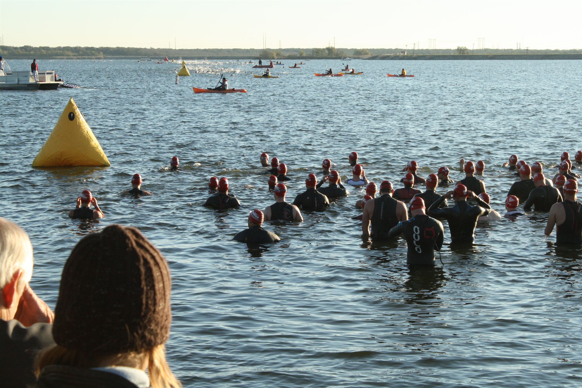 My wave went off second to last - over an hour after the race started, so there was a good amount of walking around while killing time. Eventually, I did some very light jogging a few minutes before putting on my wetsuit and then some light stretching. I put on my wetsuit about 15 minutes before my wave and walked down to the start area.