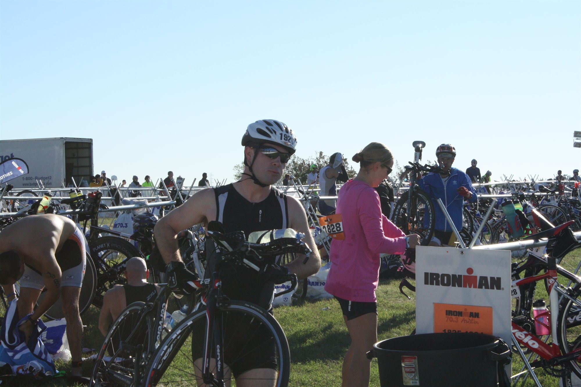 Comments: As mentioned before, I was VERY nervous about the temperature outside having had some bad experiences with cold weather on the bike on training rides. This time I had toe covers and full gloves with the rest of my normal kit. I think I was helped at least a little by the fact that my wave went off at 8:35 versus the start at 7:30 because I could not have been more comfortable out there! I was shocked and this made the ride so enjoyable! Everything I had read said to take the bike portion easy - at least for the first hour...or maybe the first half of the bike portion. I took this to heart after having driven the beginning portion of the course the day before. Being from Dallas, we just don't have a ton of hills and it's not something I've emphasized in my training. After seeing what the course looked like some the day before, I became nervous that I would not perform well because long, sustained hills and I don't get along well, so I knew I had to ride conservatively. I was going along minding my own business (still probably only 7-10 miles in?) when there was a short, but steep, climb. I began to shift down and then immediately knew something was wrong. I couldn't shift, so I immediately pulled off to the side (fortunately, because of the hill, no one was flying past me at the time making it unsafe for anyone). I was pretty sure that if I could just turn the crank with my hand and shift the derailleur that it would work itself out. It worked, fortunately, but now the little task of clipping back in with bikes coming past me and in the middle of a steep hill. I laughed at myself a little bit, looked up the hill, and decided I would run up the hill carrying my bike (I'd already done it coming out of transition, what's climbing a short hill with it now, right?). I only lost a couple minutes, but I was hoping this wasn't foreshadowing what was ahead of me. After that, I continued to take it nice and easy for probably the first 20 miles. The roads on long stretches were not very good compared to what I'm used to and I think I let it affect my pace some. The roads combined with the fact that I needed to pee made for an uncomfortable stretch! :) I'm not sure what I was averaging over the the first half (and didn't care!), but I knew I'd survived what would be the hardest hill section until the end and decided to push things a little more. I kept going back and forth about whether to stop and use the porta-potty at an aid station, but I knew my legs felt so good that I didn't want to stop, plus it always seemed there was at least a couple people waiting at each one and I didn't want to waste the time, so I stuck it out until the end of the ride. At about 40 miles, I was still feeling very good and I knew that if I wanted to make up any time, it would be on the bike because I'm not a particularly strong runner...so I took off. It was a nice flat stretch of road for a number of miles and it was nice to open it up. There was one small problem - I got stuck behind a truck! I couldn't believe it. I was passing a number of other riders, but this truck couldn't get around them and I couldn't get around it. Eventually, the driver would find an opening to get around a clump of riders, but then would get stuck again and I would catch up. Maybe I was being saved from myself and a blowup on the run from tiring myself out. If getting stuck behind a truck for a couple miles was the worst thing that happened to me all day, I'll take it. The last couple of miles, I took it easy knowing that I needed to prep my legs for the transition and run. What would you do differently?: I would push a little harder earlier in the ride. I think I might've left some time on the table. While I think I handled the hills well, I would prepare more for them with hill repeats. ![]() Transition 2