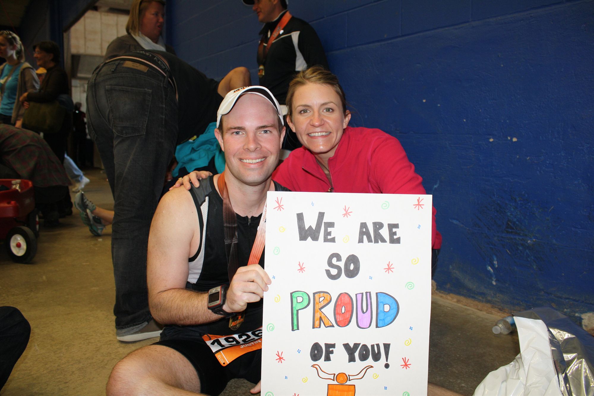 Comments: I felt like I was having a good race, but I was prepared to take it easy on the first part of the run. However, after what was a solid first lap for me and feeling strong (plus, knowing that it was much cooler outside than what I was used to running in), I decided that I was going to "go for it" to see what happens and maybe I'd be able to break 6 hours (my secret goal time). The issue with this thinking is that I didn't really have a good idea of what my time was because my watch malfunctioned on the swim and I didn't know what any of my times were. I couldn't even rely on my bike computer because of the stop I had to fix my shifting (the timer stops when the bike stops for a few moments) to know exactly what my bike time was. If I'd had all of the information, I would've known that 6 hours was not going to be possible for me this day, but since I didn't, I didn't want to find myself having not pushed and missed 6 hours by a minute or two. I knew that "going for it" was either going to prove that I used everything in the tank and had my strongest half marathon to date or I was going to blow up and end up walking a lot at the end. I made peace with this 2nd possibility. That was good, because that's what happened. I still had a strong 2nd lap (at about the same pace as the first lap), but a mile into the last lap, I ran out of gas. I walked/ran at a ratio of what felt like 1:1 which made for a pretty slow last lap (a little over 11min/mile after the first two laps of 9:30 or so). It wasn't as bad as it felt at the time, but it still took a lot of time off to slow down so much over the last 4.5 miles. Oh well. I was still proud of my run. What would you do differently?: Overall, I felt good about the run, but know that there's things I can do to improve. If I said that I wasn't used to hills on the bike, I REALLY wasn't used to running them, so running more hills in practice would be a positive, so even if I have a flat course, I would be prepared for it and stronger for it! ![]() Post race