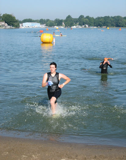 Comments: Had an awesome swim. I started up front on the beach and charged in. There weren't a whole lot of girls in my wave, even though all women in the international distance were in the same wave. Didn't get bumped or jostled at all. There were 2 girls who took off and I lost them from the beginning, but for 98 percent of the swim, I was alone and just cruising along. My navigation was surprisingly good, except the buoys were hard to see coming back into shore due to the sun. Couldn't believe people were wearing wetsuits! This water was like bathwater. And I think some people were freaked out by the fact that the water was GREEN, very, very GREEN. To the point where you couldn't see your arm when it went into the water. AG- 2/3 OA- 23/72 What would you do differently?: Nothing really, maybe swim a bit harder? ![]() Transition 1