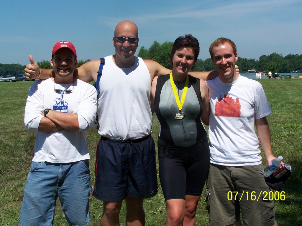 Warm down: Couldn't take a gel because I had no water and I knew I couldn't get it down without it. Thougt I should just press forward to the finish. Could see girl in blue coming behind me. Oh crap. Started to push, felt ill. Got passed by a guy who asked how I was, I decided to be honest. "um, I think I might be going into shock, and/or hypoglycemia...I'm not doing well but I just want to finish". But this point, I'm like, less than .25 of a mile from the finish. He takes off, and I can see him telling people to get the medics. At this point, i'm shivering, hurting, and really incoherent. And I'm about to get passed. So I start sprinting, and my BF joins up with me. Girl in blue yells at BF to stop pacing me (wtf?), I try to pass her, with about 4 feet left in the shoot, and I just let her go. I walk the finish line, get my chip taken, and the medics come over and fixed me up, along with help from BT'rs Buckeye66 and his SO and Stupidnickname. Apparently, as I was finishing, the RD announced my name, and kept asking if I was ok, like 3 times...don't remember this really. Girl in blue must have thought I was a maniac, but then I saw her in the finish tent...she was only 19. Not in my AG. I laughed and apologized. Huge blister on the instep of my foot as well. BUT! I also got some AWESOME news when I came in the finish tent... I PLACED!!! I got 3rd! Yeah! I was a bit disapointed..everything had been packed up by the time I finished and most of the food and stuff was gone by the time I finished. I want to find the guy who was ahead of me and thank him for sounding the alarm ahead of time...really appreciated it. The volutneers were awesome too, they came up to me at the end and were asking how i was and telling me i had a good race. What limited your ability to perform faster: Diabetes, heat, lack of run training, not wearing socks on the run. **EDIT*** I always hate when results come out. I feel great about my race and then I see how crappy I did. My run time is absolutely disasterous. I've put so much into running, you'd think I'd be able to do better than that. Event comments: There were no bike marshalls, although the Fairfield county Sheriffs were AWESOME. I saw a bit of drafting going on as well. Also no bike aid stations for the INT bikers. Would have liked a bottle drop. Transition/finish area had no water fountains or really anywhere to fill water bottles up...not good. Also, the website directions took you nowhere near where you wanted to be, and we got lost (as did several others). Would have thought there would have been more aid stations on the run, considering the heat. If it was a cooler day, what they had would have been fine, but on a 95 degree day, spreading them out over the 10k would have helped. Last updated: 2006-05-27 12:00 AM