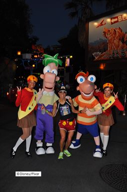 First 3 miles were awesome and I was able to take photos with these goofy characters (Phineas???) and then the "Genie" from Aladdin, as well as some crazy Prince/Princess who I still cannot figure out.