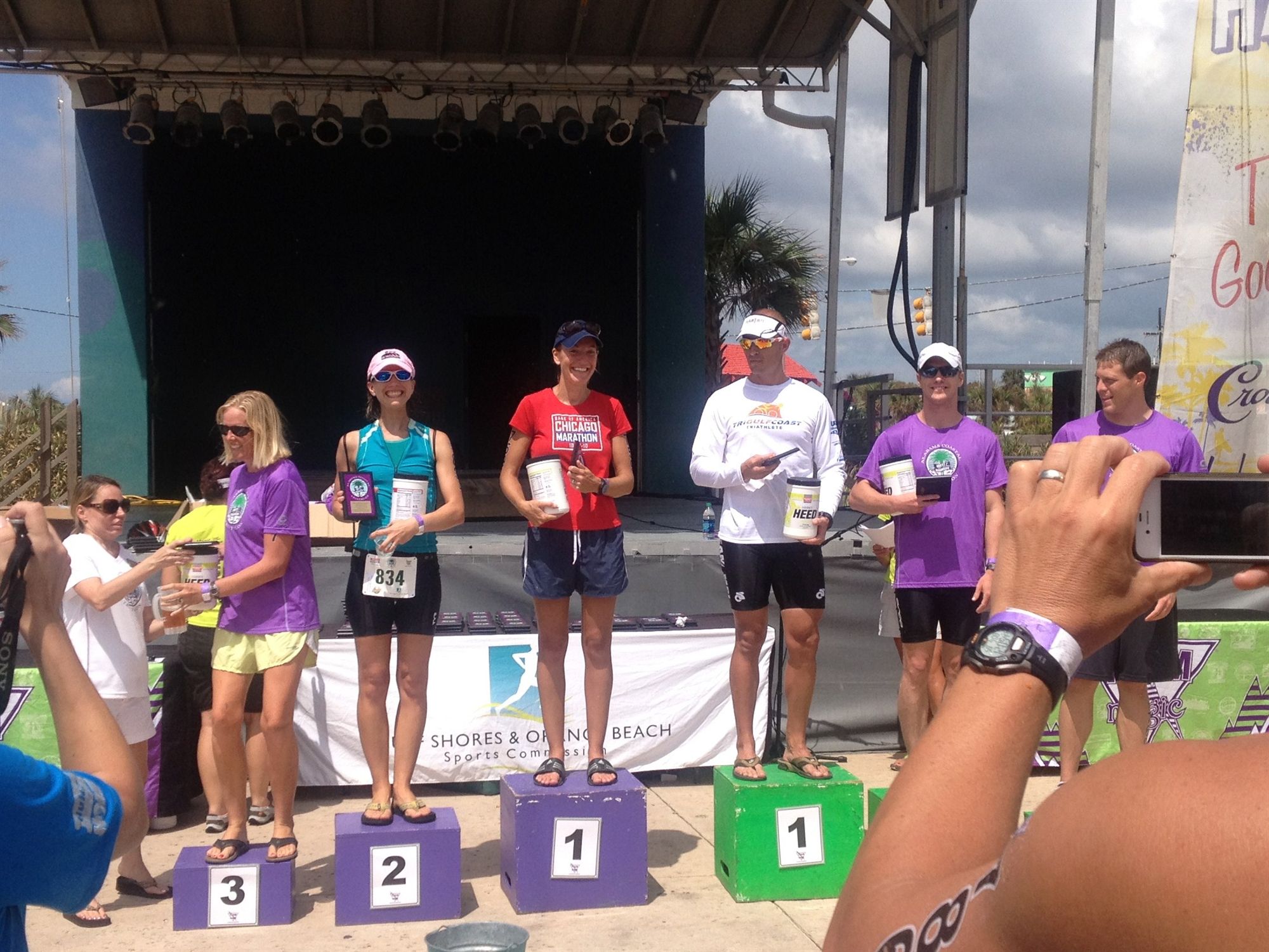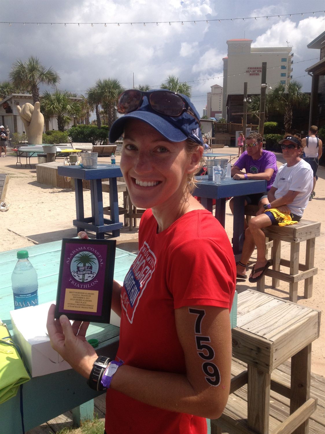 Warm down: They had a tent with water pouring from the top and some chairs set up which was a life saver, and I spent quite a bit of time just standing in the shower cooling off. Other than that I didn't do a warm down. What limited your ability to perform faster: The heat and definitely my swimming anxiety. Event comments: Very well organized and fun race. There were plenty of volunteers, police, and aid stations, and I would definitely recommend Team Magic races for anyone interested racing in Alabama or Tennessee. I also got a very cool plaque for winning my division, a tub of Hammer Heed, and a beach bag that I won in the raffle. Last updated: 2012-07-25 12:00 AM