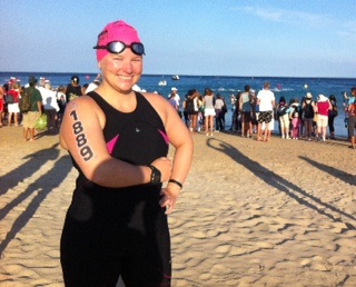 Ran a little on the beach and swam about 400m. Dried off and did some stretching and arm circles. Watched to pros and the AG men go off and then got in the water with the other pink caps to wait for our cannon start.....