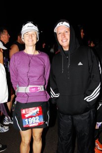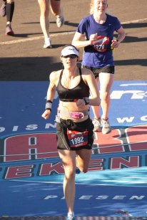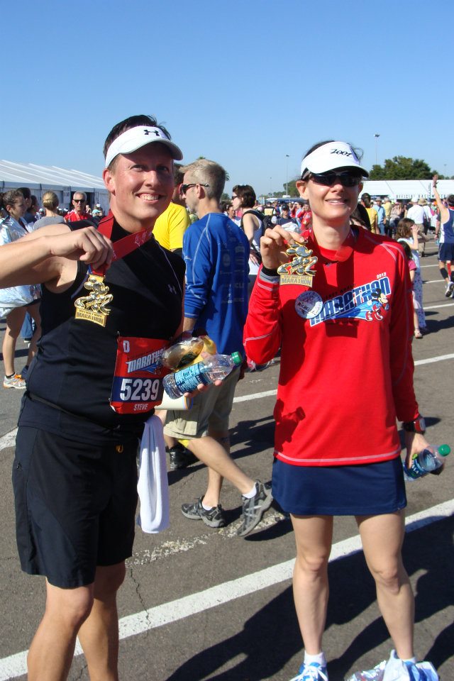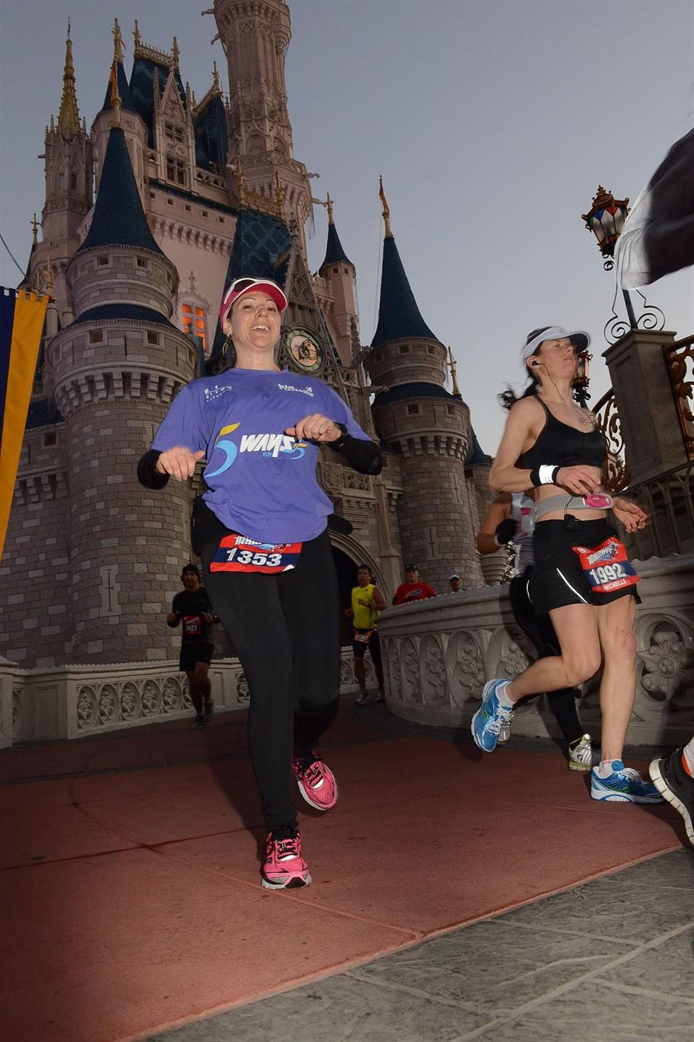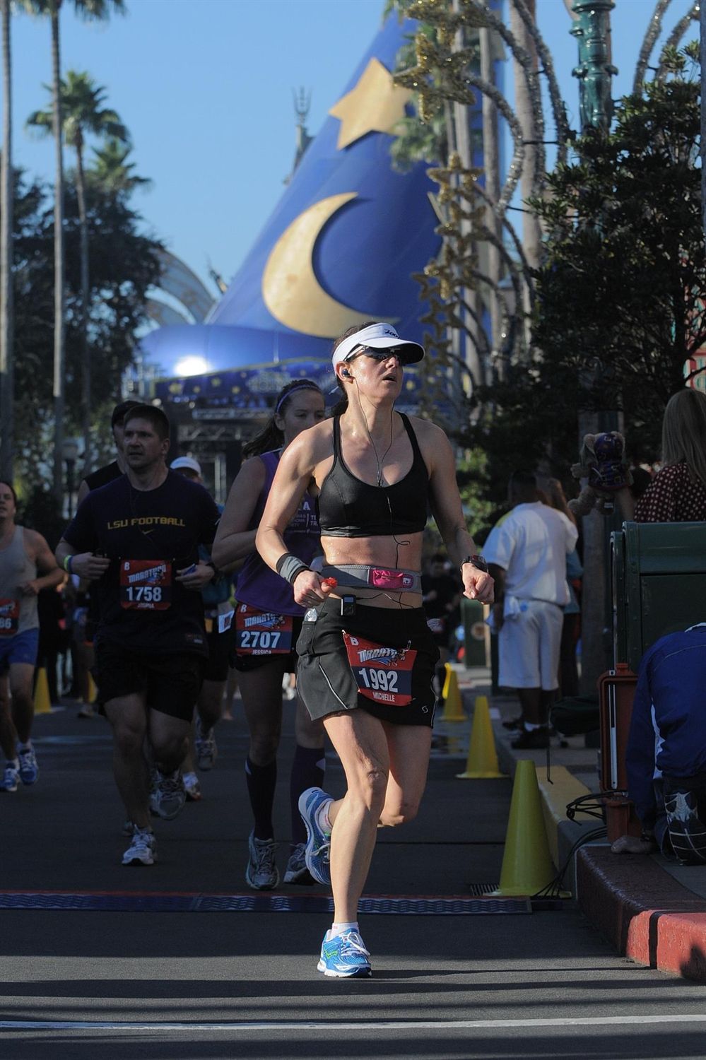 Comments: There were several people in front of me, so my first mile was slow. I don't think this was a bad thing because it kept me in check. I had my MP3 player with me. I had never raced with music, but I thought it might be nice for the marathon. The songs in the first couple hours of my playlist were smooth and flowing. I put more uptempo and aggressive music toward the end. Most of this course is very flat (overpasses are the main exception), which was nice for pacing. The majority of the course is not in the parks, but on connecting roads. Disney is good about putting characters and other diversions along the way, which was fun. Many of the male runners took advantage of the non-park portions to turn their backs to the road and relieve themselves. Many, many, *many* male runners. I had run 100+ races, but this was a completely different animal. After my first mile, I was hitting sub-9s with regularity (a 4 hour marathon is a 9:09 pace) and was feeling good. I tossed the gloves around mile 3. I think I saw the 4 hour pacer around mile 8. I ran with them for about half a mile before I decided to pass. I felt like I was really holding myself back to stay with them. The sun was starting to rise as I approached Cinderella's castle. It was an incredible site and I actually got a little misty-eyed. In the reports I read, some people had complained about sewage smells near the Animal Kindgom, and yes, it was there, but it wasn't too bad. There were some fun little signs with Donald Duck trivia around this area (Donald has been in more cartoons than any other Disney character). I saw my husband around mile 19. I waved at him and then he saw me and snapped a picture. The course then hit a an out-and-back stretch that some people had complained was boring, but it didn't bother me. Next was a bit of a hill, but the Toy Story green army men were there cheering us on. When I passed mile 20, it was neat to think that each step I took was the farthest I had ever run. I think the Hollywood Studios portion came after that. I had never visited it or even looked at pictures, and enjoyed seeing it. It was kind of Old Hollywood. The final part was heading back toward Epcot. When I hit 23 miles, I was feeling good and tried to pick up my pace (hey, I know how to run a 5K!) and I got slightly faster. There were some little rollers in the Epcot area, but there were a lot of spectators and cool buildings to look at. Disney put our names on our bibs, and I got some personal cheers. There was a gospel choir (mile 26?) toward the end, which was really uplifting. I was still feeling pretty strong and overwhelmed that I was almost done with a marathon. I was also going to break 4 hours easily. I saw Minnie near the finish line and ran toward her to give her a hi-five as I crossed. Kudos to the folks in those costumes - they jumped around very energetically. The characters took turns manning the finish line. When I as I approached the finish, I felt like I could have kept running for a few more miles, but I was certainly glad to stop. Once I did stop, though, it was all over. Let the limping begin! It had also gotten warm by this time. The heat hadn't really affected me, but it did get to cousin Steve who finished about an hour later. What would you do differently?: Not much, really. I thought it was really good for a first marathon.  Post race Warm down: Walk to the medal giver, bag pickup, and reunion area to meet up with Ted. I changed into some fresh clothes. I didn't notice it until I got back to the house to take my shower, but I had some serious back chafe where my hydration belt had been. It was really bad on the right side. I hadn't even thought to put Body Glide there :/ What limited your ability to perform faster: Inexperience, lack of marathon fitness. Event comments: I chose this race for my first because I knew there would be lots of distractions on the course, and if things went south, I could just chill out and enjoy the characters. The race was well run and fun. I want to come back again some time and do the Goofy Challenge. Last updated: 2012-12-20  12:00 AM |
