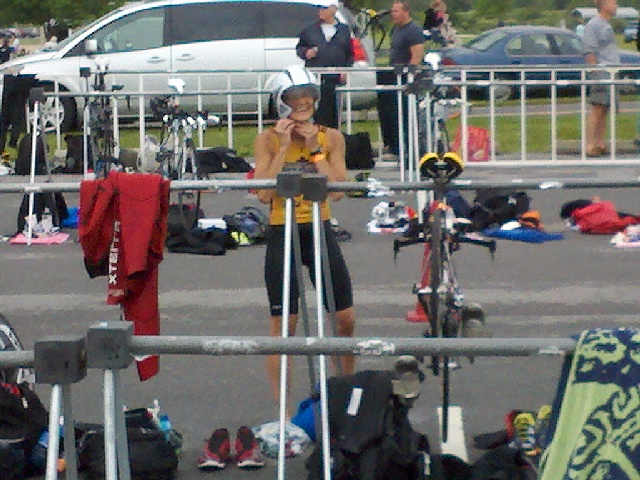 Comments: The grumpiness from the swim time really kicked in here with the strong winds on the bike. I saw Matt turn into the park finishing his bike and was able to give a shout because he was doing great! The course is flat as a pancake so I thought that the headwinds which hit me at the first turn would be nice tail winds on the other section. Instead I had headwinds then crosswinds then a slight tailwind where I cranked as hard as I could on about a half mile stretch then crosswinds again and then stronger headwinds. Repeat. At times I saw my pace drop to 16 and at times I felt like I'd be blown off my bike so I got out of aero to hold on. That made me grumpier, but I was giving it my all. I was passed by two guys and two girls during the 25 miles and I passed a bunch, too (just didn't count). My goal was to do 1:15 but that was before the wind factor so I thought I'd been out there forever and my brain couldn't do the math (duh). I wasn't pleased with my performance until I got home on Monday and saw the results online. Bike - 1:15:44. Yippee! A 6 minute improvement over last year. What would you do differently?: Again, maybe leave the watch at home. It was only a hindrance to me this race. Change my attitude. Don't let a number on a watch determine my happiness level. I love my bike. My average pace on my Oly in May was 19.1 (hillier course) and this one was 19.81. I'd love to see 20 so I'll just have to keep working. I'm confident without the wind I would've gotten it, but que sera, sera. ![]() Transition 2