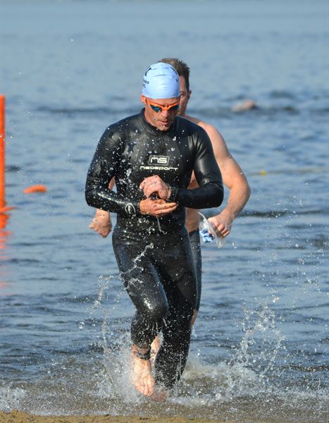 Comments: I started the race in the front line of the race, lining up with the fastest people in the group. This was the first time I actually felt comfortable starting up front. Patrick and I were side by side to start the race and we were stroke for stroke for the first hundred yards. Then he (at least I think it was him) climbed over the top of me because I had sighted poorly and was beginning to get slightly off course. When I noticed this I took an extra second to check myself and get back on track. As I got about 2/3 to the turn around I began to try to control my stroke a little more. I had begun to feel slightly heavy and I backed my arm speed down slightly to help bring things under control. The rest of the way to the turn around I encountered a few people from the earlier wave but was able to navigate through them easily. I was able to feel their kicking and turbulence as I approached and would take a brief second to determine which side I should pass based on the closest angle. As I got to the turn around I noticed only one person to navigate through as I rounded the pontoon boat and headed to the beach. On the way back I took a little better route to the beach by sliding up next to the rope to allow a better navigation and a smoother swim with better form for the final leg. I also knew this would likely put me into more traffic from the other waves but I thought they might be scattered out and allow me to get through without giving up much time. As I pushed through some of these athletes I was kicked in the side and nearly kicked in the face once. At one point I came along side another swimmer so fast that I grabbed his hip as I had just begin my pull. This seemed an odd timing kind of thing. I simply continued my pull but I am sure the other swimmer thought I was pulling him backward. This occurred about 2/3 of the way back to the beach. As I was finishing the swim I encountered more swimmers in small groups and found it harder to navigate through them. They had begum to walk or attempt to run toward the beach far to early, in my opinion, and I had to stop swimming sooner than i would have liked because they were side by side. When I stopped swimming I was just above waist deep water. I could have been a few seconds faster had I been able to get those last few strokes in. What would you do differently?: I believe I could have worked a little harder in the latter portion of the swim. I think when I relaxed my stroke in the first half of the race I dialed back a little more than I should have. I did set a new PR for this course but only by 1 second so I'm not really counting it much. ![]() Transition 1