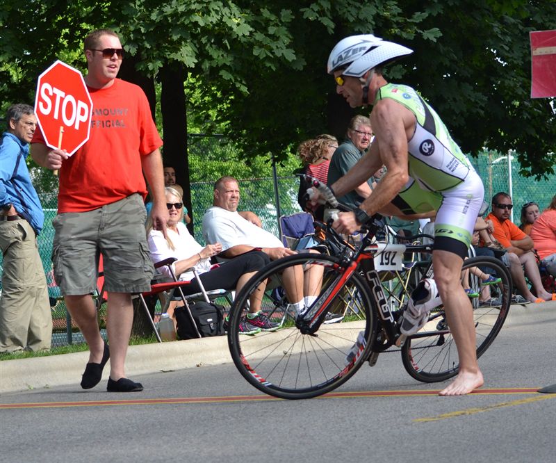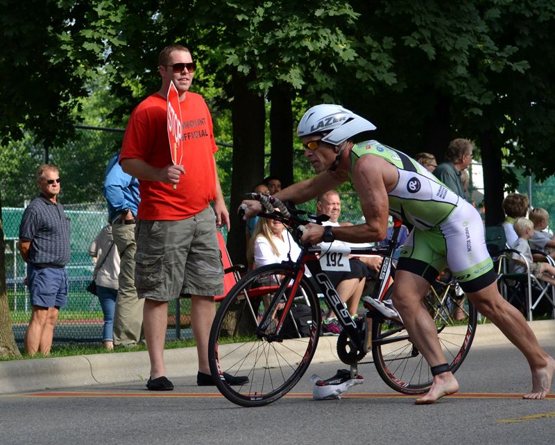 Comments: As I was leaving transition I was trying to figure out just how soon Patrick was going to be on my tail. He's been a stronger cyclist than I have been and I just knew he was coming!! I got the mount line and climbed on, started pedaling and got into my shoes. I was happy to have been able to get the on faster during the race than when I was doing my warm up. I had some difficulty getting them on then and had to climb the hill attempting to wriggle my left foot during the WU but now it was fairly smooth. As I climbed the hill I was already beginning to pass some of the previous people waves. I was to busy trying to navigate between people to notice if there was anyone in my AG. I kept working up the hill and through the short, slow, uphill turns that are all over the first mile. Once out on the main course I was able to get some speed up and see what I had in the tank. The first couple of miles seemed slow and hard but my average speed tells a different story. The first mile was 21.6 with the climbing and winding. After the first mile I was over I was above 24 MPH for all but 2 miles. Now, after the race and seeing the data, I have concluded that I was in a bit of an hypoxic state that comes after the swim. During the first few miles I kept on the throttle hard trying to fend of the advances of Patrick for as long as possible. I was on the hammer pretty hard and was above MLSS for the first 7 miles. I kept the throttle on all the way out to the turn around. As I was approaching the tun around I began to think about the advantage of being in front and getting to see where my competition was after I made the turn. As I neared the turn I made a couple of gear changes and to get ready to lean on the throttle after rounding the corner. With this corner being a long turn around it has the advantage of being able to carry some solid speed through it. I was carrying too much however. I hit the corner hard!! I hammered the brakes enough to slow very quickly but keep a skid from happening. I leaned into the turn and looked for any loose sand or gravel and judged the far end of the turn. I determined I was going to fast to get through the turn without going into the yards. I had to nail the brakes again but I still was carrying enough speed to have to go off the road. I hit the edge of the road where there is sand and loose stone. I got a little loose in the front because I was still in a bit of a lean but held firm and came out slower than I wanted to, but upright and still moving fine. Now, out of the turn and headed home, I began to look for Patrick. It was another half mile before I saw him. I felt I was holding the gap but I wondered just how much it was going to cost me. I kept the hammer down and waited and waited and waited, but Patrick never pulled close. I finished the route back toward transition through the road we had went out on. There was plenty of passing to do at the speeds I was carrying. I remember thinking how fat I as moving past some of these people and wondered if I was blowing myself up. As I continued to work my way through all of these athletes i noticed they became thinner and more sparse. At the top of the course, where the slight downhills and curves are about to begin I began to pull up on another rider. He was riding in the middle or the road, staying on the left side of the road. This aggravated me because he is supposed to be on the right. He had passed a couple of people but never moved back in. I had to pass him on a turn. Luckily he moved toward the curb slightly at the turn and I had plenty of room. I then began the descent into the lake area and through the hard 90 degree turns at the bottom. As I began the descent I picked up some speed but planned to downshift toward the bottom to get ready for turns and be ready to accelerate once through. I got to the bottom of the hill again carrying to much speed. There were 2 men directing riders through the area and one of them yelled to slow down. I was in the midst of nailing my brakes and was able to stay only bout 1-2 feet from the curb and then had to abruptly right the bike and turn left hard again. After this left turn there was another longer left run that more speed can be carried into. I grabbed the horns and pounded on the peddles and gained more speed. I made the final left run onto the main street in my aero's and mashed the gas for the final push. I was carrying a lot of speed in the area but it was one of my slowest miles because of the hard cornering. As I neared the transition area I came out of my shoes and got ready slow for the dismount area. And this is where it got interesting for the dismount judges! I was coming in so fast that the judge yelled to STOP!!! OR YOUR'RE GOING TO GET A PENALTY!!!" I narrowly escaped by getting my feet off the peddles as my front wheel crossed the line. My dismount was hard!! I didn't intend on making it as close as it was but if I had hit the brakes harder I would have been over the top. (See the pics) What would you do differently?: Nothing!! I hammered this one out and was able to hold a decent run afterward and that's the goal. ![]() Transition 2