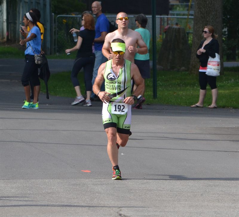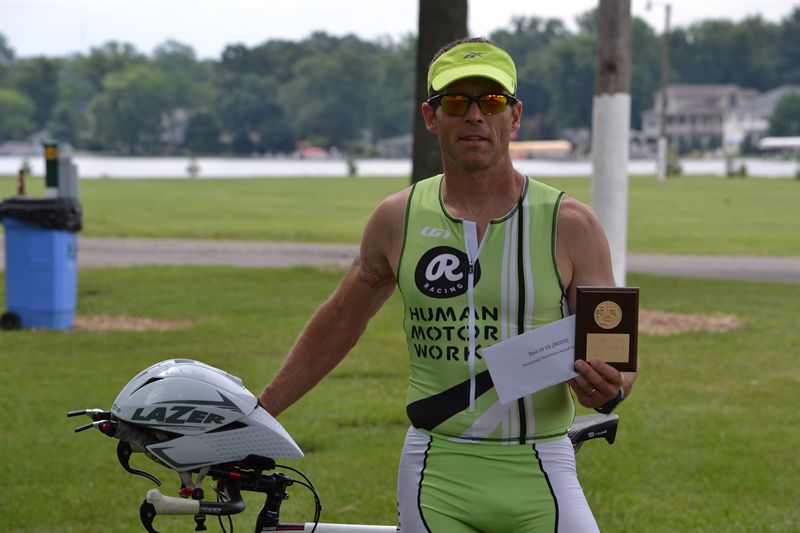 Comments: This run began with a much better feeling than I usually begin these race runs. I didn't have the stiff back and lungs screaming to relent. That's not to say I was not suffering. I was indeed suffering within the first .25 mile! As I ran out of transition I was still feeling like Patrick was on my heels. I know that our first meeting had him pass me late on the bike and I passed him early on the run. Then our second meeting he came out of the swim ahead of me and I couldn't keep up with him on the bike. This time I wanted to keep him at bay as long as possible, so I stayed on the pressure. The first mile was tough. I really began to suffer about a half mile in. This was where the lungs began to scream for more air that was seemingly unavailable. Most of this section of the run is through a wooded trail that is paved and winds through some very small inclines. The shading makes for some relief when it's hot but today was great racing weather. This was some relief but the pressure to race well kept me from backing off. It was a little past the first mile that a man came flying up behind me and said I had a great bike. It turned out it was the man I had passed late on the bike just before the turns. He was flying! (I actually remember him from last year too. He tried to keep me from passing him with about .25 miles left on the bike.) I tried to check his age from the marking on his legs but I was unable to see through the sweat burning my eyes and obscuring my glasses. Even from the early point of the run I was passing people. I was only passed once on the entire run. I also noticed that I had not encountered any of the early runners headed toward the finish line yet. This allowed me a glimpse of just how close I was to the front of the pack. I had passed so many people on the bike and now passing people on the run with no one coming at me yet was kind of inspiring me to keep the intensity hard. I was about 1.5 miles in when the first runner returning to the finish came up in front of me. He was cruising!! I was still in the wooded area but nearing the housing addition. As I came out of the woods I had only seen 3-4 people headed back, but now I was suffering enough that I didn't really think about how close I was to the actual front of the front. I actually began to want to slow down some to find some relief. I rounded the couple of turns through the housing addtion and back onto the road leading out and back to the wooded trail to return to the finish. It was after the las turn out of the addition that I saw Patrick. He was about a half mile behind me if that was him. The only thing is I am not sure it was him. If it was him he was absolutely flying if he was able to finish about 45 seconds behind me for the final finishing time. I headed back into the woods and talked myself into believing I could finishing this race strong. I was struggling to breath well and was trying to suck as much wind into my lungs as possible. There were a couple of down hills that I allowed myself to slow slightly to recover in some way. I justified this because I knew I was coming into the hardest part of the run. There's a hill that is a long gradual climb that can suck the life right out of a person. As I was getting ready to come out of the woods I passed a guy that commented after I passed him that I was the first 40's guy to pass him. I found my strength with this comment again. The timing was perfect!! Immediately after coming out of the woods the hill climb begins and I was now ready to attack it with more passion than I might have had without the previous mans comment. I made it to the middle of the hill and saw Lis taking pictures. I glanced at her, smiled and waved and kept motoring. Once at the top, as always, the HR spike occurred, drawing the life from me but I knew I had only about .6 miles to suffer. Pressing on I moved toward the hard downhill. On the way down the hill I kept control as long as I felt I needed to keep from falling down the hill on my face. At a point where I thought I could sustain allowing gravity to take over I let go and began to "roll" down the hill. It was actually a narrow escape from falling, sort of. It wasn't like i was beginning to fall but if I had needed to run that fast for another 20 feet I might not have been able to control my legs any longer and I would have fallen flat and rolled to the bottom. Once at the bottom I was able to recover slightly and began to head toward the finish. The rest of the course was flat. I made it past a few athletes I know that weren't racing and they helped push me mentally toward the finish. And today, for the first time ina very long time I was able to push slightly harder for the last 100 yards and finish harder. What would you do differently?: The last push seems to be an example that I had given in to the pain to much today. I relaxed out on the course a couple of times when I shouldn't have. This is the one disappointment I have for the day. I made a tactical error and submitted to pain and I am normally able to keep that pressure at bay. Am I becoming more weak mentally? We'll see at my next race in Muncie for my "A" triathlon of the season. ![]() Post race