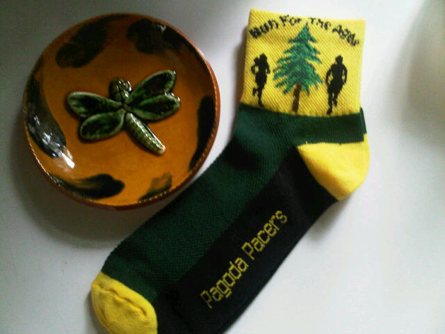 Warm down: Oh, you mean after I stopped using a tree to hold me up while I gasped for breath? Ice pops! Water! Raffle prizes! I won my choice from a variety of goodies: a leftover , unclaimed AG award from last year. A local potter hand makes the awards from terra cotta and glazes nature things on them. Last year was a dragonfly, which has special meaning to me. I hope I get the chance to pick one next year, too. This year's little plate/bowl had some sort of bird painted on it, didn't see one close enough to identify the species. Heaven knows this is the only way I'll get my mitts on any of these awards! Food line was ri-DICULOUSLY long, so I just jumped in to grab an ice pop. That one tasted so good I had another! Eventually, during awards, the line was less and I picked up a banana and some pretzels. All the watermelon was gone. :( What limited your ability to perform faster: Being old and fat and slow. Event comments: Real time results: Place LAST FIRST GROSS ADJUST NET 199 PAYTON MELANIE 1:50:19 0:20:00 1:30:19 Adjusted: 196 PAYTON MELANIE 1:50:19 0:20:00 1:30:19 (gross is from when the first race group started and net is my actual time. 20 minutes is the time from the start to when I started, the 'age adjusted' allowance) Improved my time by 8 1/2 minutes from last year. Course info and details about what an age-graded race is from Pretzel City Sports website: Come out for the fourth annual running of the only trail race with an age graded start (that we know of) on the east coast. Top age group performers have a legitimate shot at the overall title. Even if you aren’t out to win, the race is run on challenging yet very runnable trails in beautiful Nolde Forest, has great schwag and virtually no bottle necks. Challenge your families and coworkers to come out and compete on a “level” playing field… Hey ringers: Here’s a chance to show off a little by passing the whole pack! The top 10 in 2012 had 5 men and 5 women spread over 10 different age groups. What’s an age graded start. Those who have more than a few of grey hairs or have yet to hit puberty will get a head start based on age and gender. Typically the oldest female wave starts first. Then the next wave will start, based on 5 year age groups, working back toward the younger (faster?) folks. Wave starts will bounce back and forth between sexes, as the handicap derived from the World Masters Association dictates. The actual handicap for each division is posted at www.PagodaPacers.com and will be declared final for 2013 a month prior to start. That means you start with your age group (call them your competition if you like). Your handicap division may or may not start with another handicap division. For example, it’s possible that 60-64 year old men might start at the same time as 50-54 year old women. Or maybe not… Last updated: 2013-04-10 12:00 AM