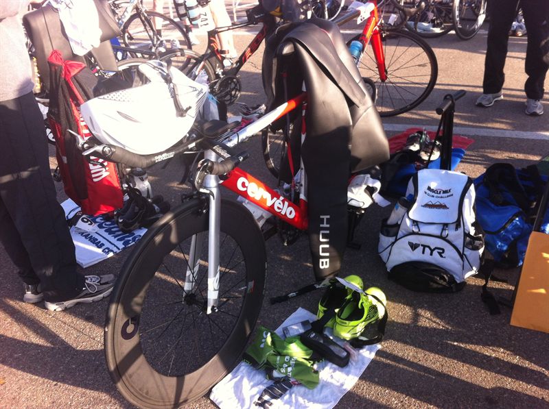 Comments: The bike course was a short 10 miles which had a some tight turns on the way out and way in which left closer to 8-9 miles to really open up on. It was difficult getting around people for the first few miles and I felt rather constricted on the bike. Naturally the Carbon Six 90s where performing awesome and with about 200 feet of climbing for the first 5 miles the relatively flat course should have been very fast. I turned in a 26:48 min time over the 10 miles for a 22.5mph average which while numerically slow was in the top overall for the route and conditions. The last mile or two was twisty and turny on a side walk with a number of 90° turns really ruined the average and with the narrow shoulder & gravel made passing a challenge. I suspect getting out of the water a few minutes faster would have saved me a bunch of time on the bike over all. ![]() Transition 2