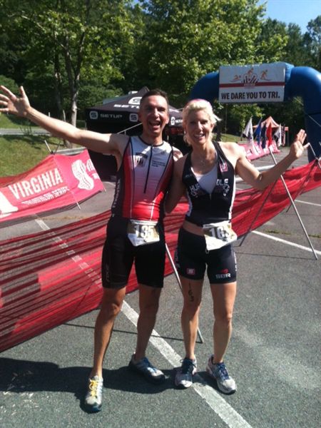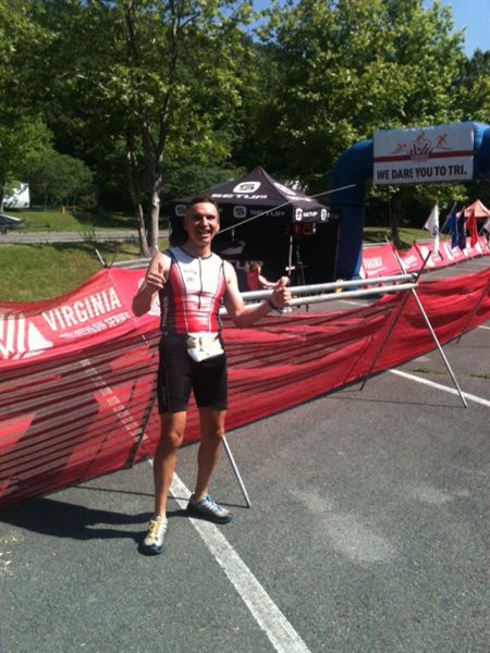 Comments: Note that the BT pace calculator here is incorrect for some reason. This was a ~7:05 min/mile pace. Okay, here's where things got TOUGH! Now, I had read previous race reports and was armed with the knowledge that this was a tough run course. And my friend, Jenn, and I drove in on the course come race morning. I thought, "Oh, THIS is going to be fun!!" And the fun begins nearly immediately after T2 when turning right onto the road from the parking lot as I'm faced with a fairly steep looking hill! Okay, let's get this done! I shorten my stride but keep a quick turnover going and pass a few folks before getting over the top. Gravity takes over as I zoom down the other side and pass a few other folks. Oh my - I'm already breathing fairly hard! Trying to recover here on the downside so I can keep or increase pace but reel in my hard breathing a bit. Now up ahead, I kinda set my sights on a gal who's running fairly well overall but I'm slowly gaining on. She's helping keeping me focused on moving well rather than let the toughness of this course and pace get to me. Next hill comes up and I'm pretty sure here I passed the two gals who passed and were ahead of me on the bike. And this hill is taking its toll on folks as some are walking. The gal I've been closing in on is just ahead now and just after I get over the top, I really let gravity take over as I bound downwards and pass her. More about her after the finish. Now it's kind of rolling with one final short downhill to the turn around. It's here I think I see number 10, Michael Dalsey, who's in my AG. I mentally groan and think, "Well, there's 1 AG place possibly lost" though it could turn around for me like at Kinetic. Now coming down this last short hill and I have to really slow from my bounding downward to round this cone. I quickly check my time and I'm here at 11 minutes. That's 22 minutes if I can maintain. It wouldn't be bad but I know I can do a bit better. Still have to face this course in reverse now. Get through the return rolling and climbing the reverse of the second big hill now. At this point, I really am pushing and body is attempting to tell me to stop. For just a second, I was tempted to just stop and walk. But, no...mental toughness overcame this and I just pushed onward. I'm still passing folks, BTW, especially up the hills. Bound down again on the downside but I can't really recover and I'm really breathing quite hard which is something I dislike doing but is necessary in a sprint. One really does have to redline. Last hill comes up. I had seen I was catching a guy in an Ironman Arizona top and I maintained if not closed that gap during this final climb. Man! I'm panting and giving it my all here! I think I hear someone behind me but as I get over the top and race downhill, pretty sure I left whoever that was behind. I nearly caught the guy I was gaining on but he got a burst of speed and motivation here too as the Finish is just down this last short hill and around the corner, still downhill too! If the run had been longer, think I would've caught him. But, he's maintaining the gap between us as we both zoom into the parking area, round the corner and sprint towards the Finish Line. I hear a volunteer yell my number to the race announcer who calls out essentially "Here's Dave Miller from Frederick Maryland" as I'm coming in to cross under the Finish Arch! BTW, like at Kinetic, no one passed me on the run. So, it continues to be my strong point. What would you do differently?: The run has continued to be my forte for the last few years and pretty much proved so again for this race. However, I probably should've prepared with a bit more speedwork than I had prior to the event. I could also stand to lose several more pounds to help make a speedier me. ![]() Post race