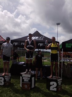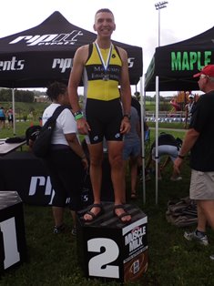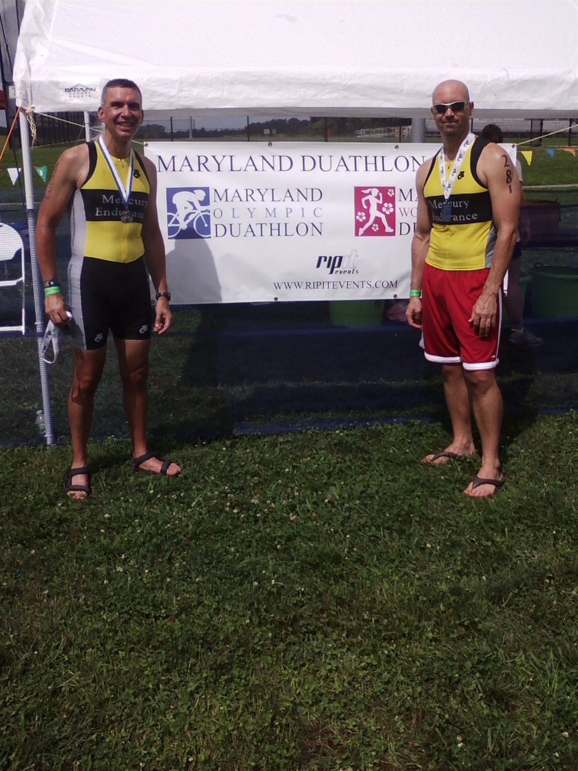 Warm down: As usual, I'm understandably a bit winded after the effort I just put in and compose myself after crossing the Finish. Nice volunteers take care of me though, draping my finishing medal over my neck, handing me a nice cold bottle of water, and asking if I'm okay. I am but just need to recompose a bit. Move forward and see refreshments ahead which I gladly welcome and take in several that are there. Not too long after I finish, I see the one guy who commented about having a nice bike and who I passed on the run after I got going and congratulate him on a good race. I realize as I'm kinda milling around that there aren't too many folks here with me which gives me a sense that I finished fairly well wrt other folks. And now since I've stopped running for a bit, my left foot starts to complain quite a bit. So, I ask the med volunteer for some ice and sit down where there are chairs for folks. Chat a bit with folks there. Though I know it's going to bother me, I decided after a bit that I'm just taking up space there for others and get back up...but...very slowly now as my foot really is complaining. I'm now back to limping and decide to check out more food but also ask the med person for some ibuprofen which she got in short order a bit later. I'm back over with the refreshments and see Dan Fulk, my Mercury Endurance Cycles teammate and club member finish around this time. Chat with him for a bit as he's winding down. Congratulate the first guy in my AG who passed me on the run a bit after this. Think Dan and I then went over to check results and much to my amazement, I see I've taken 2nd in AG! Wow! Dan is a bit disappointed with his 4th in his AG because he's taken a LOT of 4ths lately and hasn't been able to break the streak yet (fear not...he took got on the podium with a 3rd place a month later). Funny thing is, Dan only came in seconds ahead of me and he has a nicer bike plus he's a couple of AGs younger. Always good to know I can still run with some of the younger guys. So, much of the rest of the time I spent congratulating others (Patty and Bob from my club) as well as a few others as I waited for transition to open back up so I could pack up my gear. Also had to wait for the awards ceremony too. After a while I'm able to get my gear and get it packed back in my car, all the while limping along and moving very slowly. This is not good as I am supposed to race next week and also there's USAT Age Group Nationals on Aug 10! Well, deal with that later. The awards ceremony starts and I proudly take the 2nd place podium box to accept my AG medal and prizes (lock laces and a DVD video from the sponsor)! What limited your ability to perform faster: Definitely my left foot! I'm glad that it let up so that I could run and take an AG award, though. Don't know how that happened. My bike is a limiter now as well and making plans to fix that for 2014. Event comments: If I could give this race a 4.5 or 4.something, I would. Compared to Bath Co Tri a month ago, Danny and Suzy Serpico and the entire Ripit Events team certainly did treat all the athletes right: finishing medal, AG medals and awards, water and other refreshments! I highly recommend this event to new and experienced duathletes alike - nice run and bike courses, not too much traffic, not too difficult, well-marked, adequate parking, enough bathroom facilities, plenty of volunteers, and good amenities for the athletes! Western Regional Park and the surrounding communities make this a near perfect location for such an event! I will probably put it on my race list for next year! Post race notes: Due to my foot injury, I bowed out of the Hagerstown Sprint that I was to be in the next week. Volunteered instead. I also had my foot X-rayed and examined...no stress fractures. Soft tissue damage and stayed off it until AG Nationals on Aug 10. More on that in a separate race report. Last updated: 2013-06-24 12:00 AM