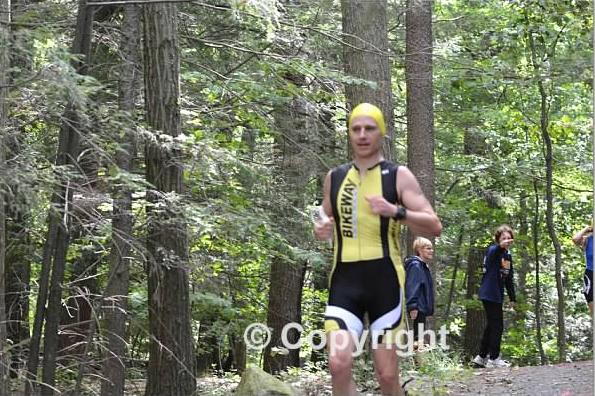 Comments: Awosting - is after the 1st 4.5 mile run, while the run had some challenging up/downs, I was still feeling fresh when it started, not so much after the swim. I immediately cramped on hitting the water, but it let up almost immediately too. I also realized very quickly that wearing my trail shoes while swimming (or at all) would be the worst mistake I made today. I was dragging 2 bricks and I'm not much of a kicker to begin with. I tried to put it out of my mind and just keep moving forward. I reminded myself that I could swim this distance with my six year old daughter on my back, just not fast :-). I do wish the longest swim wasn't the first, so I could have learned my lesson with less of a time penalty. On getting out of the water, my bad shoulder was acting up some, Time= 43:21/113th of 130 Minnewaska - after learning my lesson, stuffed my shoes down the front of my onsie and that helped a lot, but I'm still kind of a crappy swimmer and lost ground on every swim. Getting out was tough on this one. Stayed in the water to put shoes back on but was cramping up alot, along with everyone else around me. These lakes are beautiful and clean. I took a tip from Art and drank my fill of lake water from the 1st two lakes. It took some getting used to, but worked out fine. Time = 26:09, 106/130 Mohonk- my lack of swimming kept showing up, but the last swim was more of a slog after 18 miles of running 1.6 swimming and 30 biking, the fatigue was setting and I was getting punchy. I heard a voice in my head say "it's not time to nap" twice, and that gave me a WTF moment. I was stroking the whole time, but sloppily, so wasn't too worried. I also wasn't worried because these are hands down the best supported swims I've ever seen. Kayakers and scuba divers everywhere. Every time I breathed left, I not only saw a kayaker, but saw that kayaker looking back directly at me. Maybe its because I'm a crappy swimmer, but I think that is just how they roll. Also, Mohonk has the views of the mountain house, which I'd love to stay in again if a rich uncle that I don't know about thinks of me in his will. Time=23:08, 119/130. What would you do differently?: Start right from the beginning stowing shoes. And different shoes. And be a better swimmer. This race is not forgiving to half-assed swimmers. ![]() Transition 1