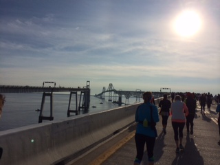 Warm down: Hung out with my friends, checked the official results. Was denied a woman's finisher shirt in my size (again, this time because they ran out early) and initially it looked like I wouldn't even find a men's, but I found a large hiding in the XL pile and held onto it for dear life as others around me were eyeing it up and asking where I got it! Beer x 2 and an excellent Bloody Mary. Oh, and a water or two. Rehydration is essential! Took the shuttle back to Cuda's car and headed home, with a little stop at Wegman's for lunch, our second visit in as many days! I love that store! What limited your ability to perform faster: Being old and overweight. Event comments: Racers were present from all 50 states as well as 11 different countries, and it is supposedly one of the 5 largest 10Ks in the country. Security was high - no backpacks or backpack-like hydration systems were allowed; racers needed FuelBelt or handheld type hydration, or these weird little clip on cups they were selling. Police ran undercover as racers, police and Coast Guard were plentiful and present in boats below while police helicopters flew by periodically. Police were stationed at regular intervals across the span as well, with ATVs and on foot. For a first time race of this size (they were expecting 20,000 racers), I was worried there would be problems, because there really were so many ways things could go wrong, but everything went very smoothly (aside from the minor t-shirt snafus, which really aren't anything in the big scheme of things). The shuttles ran on time, the race stayed on time, and even traffic on the westbound span wasn't as bad as I anticipated. I'm already excited for next year's race, and so are my friends! Last updated: 2014-01-17 12:00 AM