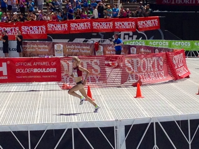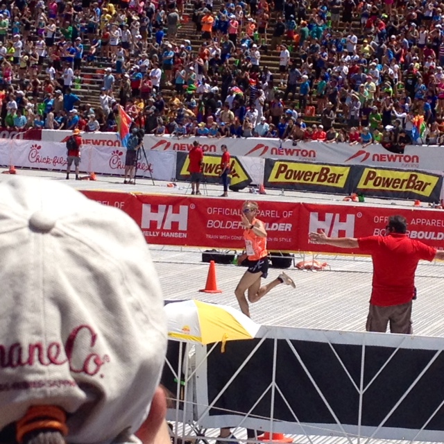Warm down: After crossing the finish line the runners proceed to be herded for quite a walk through the chip drop off then through to get snack bags and beer. We grabbed our snack bags, and beer (ok it was Mic Ultra so it wasn't really beer) then sat in the stands and watched the runners behind us finish. After a while we went out and walked through the expo, which didn't seem as good this year, and hustled back in when we expected the pros to be coming in. As we found some seats near the finsh we watched the course sweepers walk in with a wonderful older gentlemen and the crowd in the stadium went wild. So cool. After a few minutes the first female pro started to approach the stadium and again the crowd cheered. When she got in to the stadium and finished the crowd got louder but it was nothing compared to the noise that errupted when Shalane Flannagan entered the stadium. OMG I was awestruck watching her fly around that lap. The crowd continued to cheer for the remainder of the femail athletes. Then there was a lull and a few minutes later the male pros started their battle in to the stadium. There were a couple times when we could sense the men slowing down thinking they had their place secure but we could see someone gaining on them and we yelled. So much fun! And, of course, Ryan Hall. As he entered the crowd again erupted. As he passed us DS2 yelled "go RYAN" and RH turned and waved at DS2!!!!!!!!!!! After the pros finished we watched the parachuters land carrying flags for the Army, Navy, AF, Marines, Coast Gaurd, MIA and finally, the USofA. What an incredible ceremony! Anticlimactically, we shuffled our way to the bus. We boarded a bus with SIL to meet DH and my brother (and fam) for beers and lunch and Oskar Blues. What limited your ability to perform faster: Stayed with SIL and will do it again for as long as she'll let me. Event comments: This race is well done and an experience like no other. Shalane Flannagan posted on Twitter that there is nothing like entering that stadium with its roaring crowd. She called it a "bucket list" race. I agree and I'm blessed to be close enough to do it every year. Last updated: 2014-04-14 12:00 AM