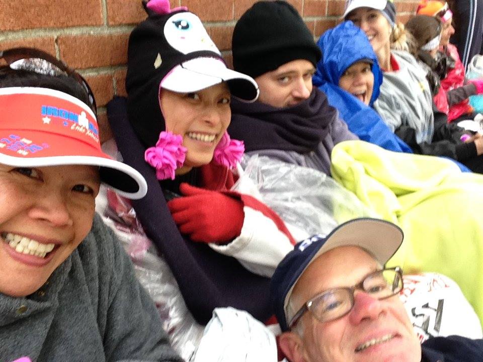 Everyone finally started to show up. Susan, who ran with us a few times. Then Paul and Yvette (a coach from my pace group) showed up. Then Patty, then Geralyn, and then finally Dan and Meredith. We all huddled together against the wall--it was cold, it was long, but it worked! The people walking around highly entertained us. They were wearing footie pajamas, what looked to be hazmat suits, boxes, bags, bathrobes. It was comical! I myself was wearing my singlet, armwarmers, shorts, calf sleeves, velour pants, a windbreaker, a heavy fleece, an old snap coat with fleece, gloves, ear band, poncho, and a bag around my legs.