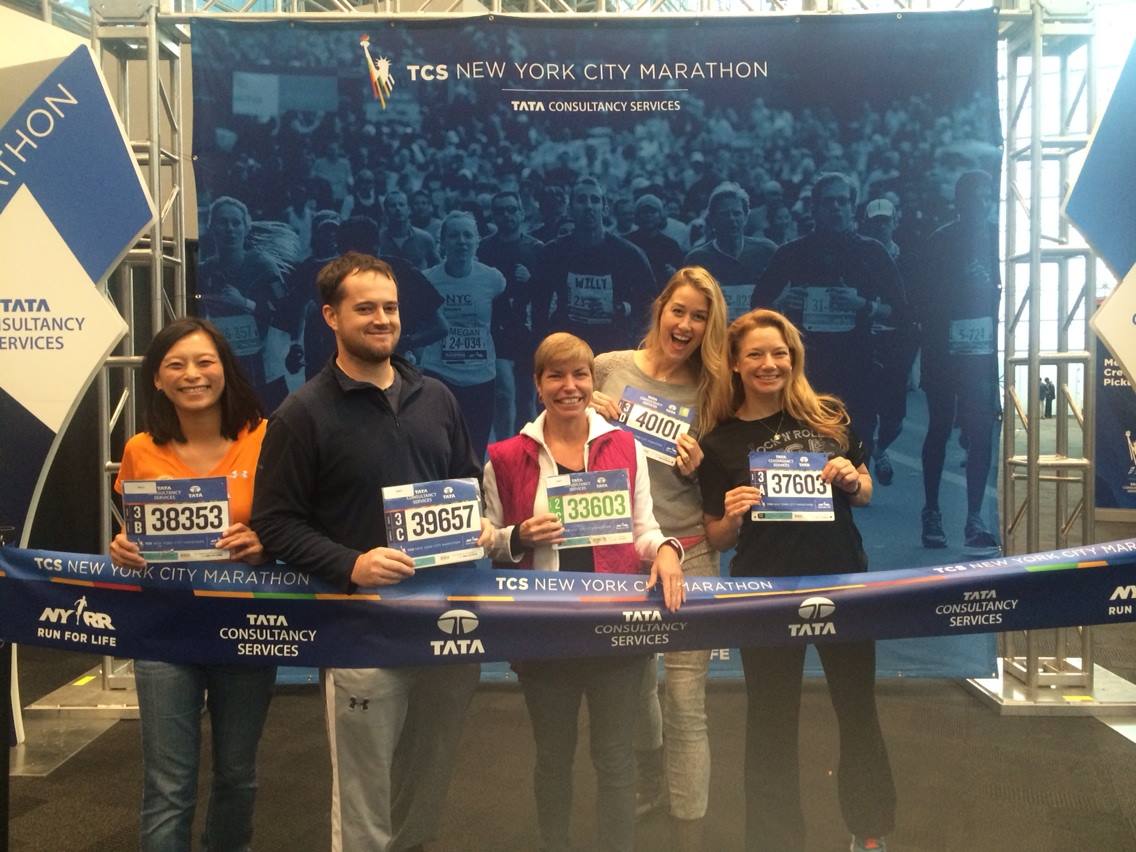 The expo was crazy! It was divided into two areas, one that was an official race information area. This part I liked b/c it was more chill. The downstairs area had bib pickup, transportation area, all the official gear, and then a ton of vendors. I chatted with the transportation people and she convinced me to take the midtown bus at 6:00. I did want to take the ferry but I wasn't sure how I was going to get there. Then I ventured out to the clothing part, which was hard! I ended up with a thin hoodie and arm warmers which I planned to wear. I was still waiting for all the other FTMers from MCRRC to arrive so I got a bite to eat--yummy burger and fries, then took a nap along a wall. When everyone finally arrived we took some pics and were able to leave around 3:45.