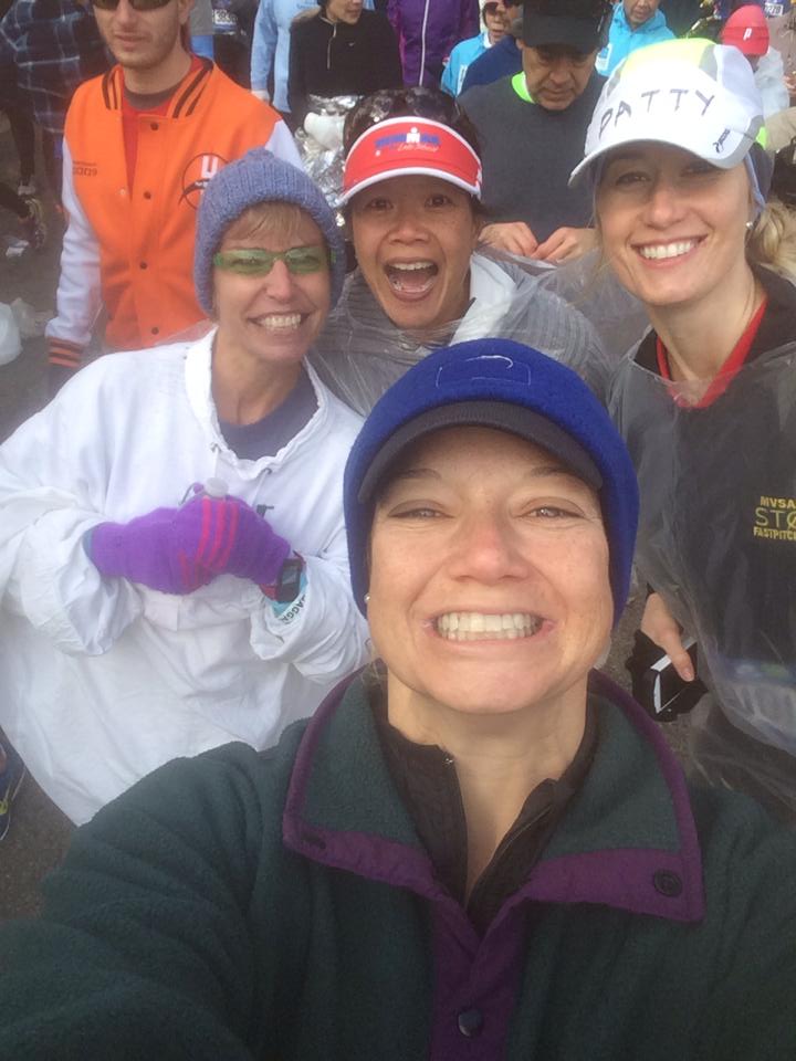 I was out the door at 5:15 since I had to check my bags and walk to the NY public library. Got there and into a line and was on the bus at 5:45. Had a nice chat with a woman from CA. We could hear the wind howling as we crossed the bridge. Holy moly. When we saw the staging area, it literally looked like a refugee camp. People laying down every where wrapped in blankets, mylars, and bags. I found a spot next to a wall and hunkered down, hoping to at least see a few members of my marathon training group.