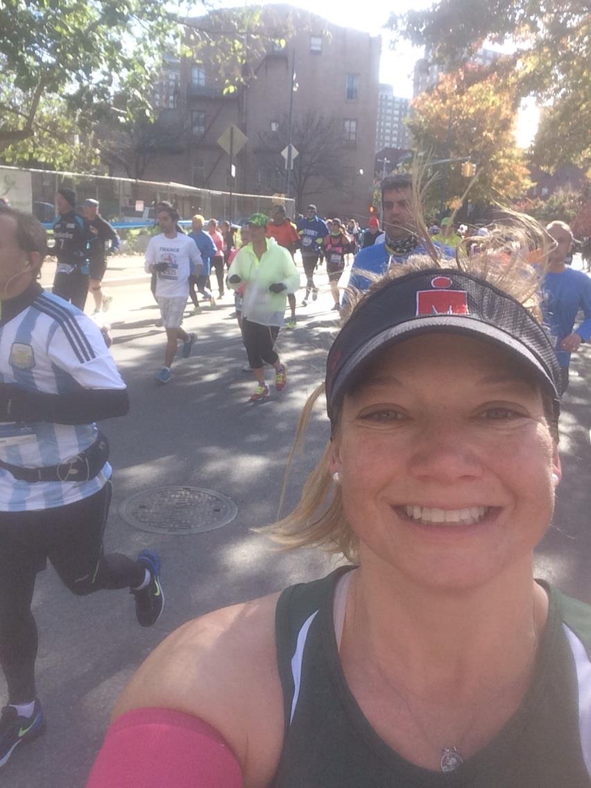 Comments: Off I was, even though I had only ran 14 miles in the last 3 weeks total. The achiness started right away, but whatever!! The bridge was insane! Hats were blowing off left and right! We were getting blown forward and backward, and sideways! I managed to run the first few miles with Yvette, Joyce, and Geralyn, but then I had to let them go. Patty and I had mainly planned to run together anyways. She had a bad achilles and I had my hip--what a pair! Brooklyn was incredible. So many people came out and brought their bands and just played on the side of the road--I loved it!! All types of music, all ages. We saw one band with men in their late 70s! So many ethnicities of people, and the signs were hilarious. But I had one major issue--I had a terrible headache. In my rush I didn't have a soda this morning, and I knew instantly that it was a lack of caffeine headache. I took two tylenol, and an hour later took two more. But I wasn't myself. although I tried to interact with the crowds and enjoy myself, I just had a hard time. My head hurt. The screaming was loud. Then at mile 15 I started to bonk. It was a long, dark, lonely bridge. I saw a man then on a wheelchair, named Dave, going slowly. Backwards, pushing his feet on the road up the hill. Seriously, I needed to stop my pity party. We ended up in Manhattan to HUGE cheers. At mile 19 I decided I"m going to walk a mile and call my mom. Had a nice chat with her and dad and they were tickled that I called them. Mom told me the wind was supposed to die down around mile 20. I hung up, and was across a bridge into the Bronx. What the heck! It was windier! My visor blew off! It was crazy, and unrelenting. But lo and behold I made it to 22 (holy cow!), and then 23!! 23 was a hard, hard mile. We were next to Central Park and it was straight uphill against the wind. Finally got into the park at mile 24. There were a few hills there, but at this point, I just ached EVERYWHERE. And it was awesome!!! I no longer felt any injury, I just felt total soreness. And I said screw it! I'm running the rest of the way no matter what! And I did! the last 2.2 miles when I was at my sorest. Up a brutal hill at the very end, and then the grandstands. Yes, I burst into tears as I crossed the finish. Heck, it had been an emotional week. The death of friend, possibly having a horrible injury and not being able to run, to being able to run three days prior to the race...plus this was the ONLY marathon I've ever really wanted to do. Did I mention it was my first?? Ok I've done 4 IMs, but this was my first marathon. In any case, I was so thrilled to finish. What would you do differently?: In terms of what I would do differently, I would definitely had brought two more gels. I needed it. I also would have loved to have had someone at the finish. It was very hard to be alone through that process. I also think I would have taken MORE pictures. Those are my favorite moments from the race. ![]() Post race
