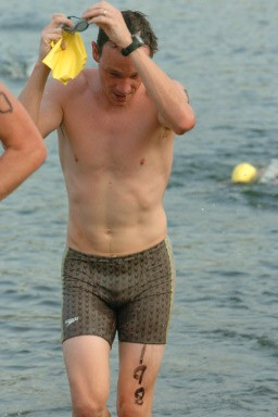 Comments: I really enjoyed this swim. Initially, I started at the edge of the group on the starting line, but there were guys climbing on each other to get a better spot before the start, so I just slid back 10 feet and watched the melee. I went out at my normal swim pace and ended up getting pinched between two guys and then getting dunked. At about 400 yards I had to stop to adjust my goggles, but only cost me a few seconds. This unfortunately ended my budding relationship with the guy I planned to draft...er ummm...site off of. I then had to switch fish, and I should have drafted off one who took better lines, because I'm sure we swam further than required. I guess I could learn to navigate on my own, but that seems so much harder. The 'race map' of the swim implied that the course is a rectangle, with a 100 yard backside. This, however, only served to disorient my already suspect navigating skills. Backside was more like 600 yards and the course was a triangle, or a rhomboid, or some other shape with a really short final leg. I'm an idiot for not seeing this before jumping in the water, but that goes without saying. One of the women in the wave behind me caught me and dunked me with authority in the last 250 yards of the swim, I couldn't tell if this was out of anger or just part of her race technique, but I was so impressed I couldn't be upset. Overall I felt really good on the swim. There was a lot of boating presence for the safety factor which greatly increased the comfort level. The water was relatively clear, for an arkansas lake. We started on time and everyone survived, what more could you ask for? What would you do differently?: not much ![]() Transition 1