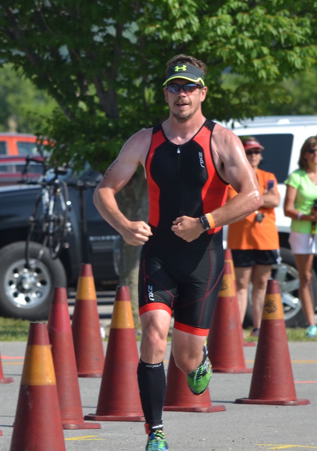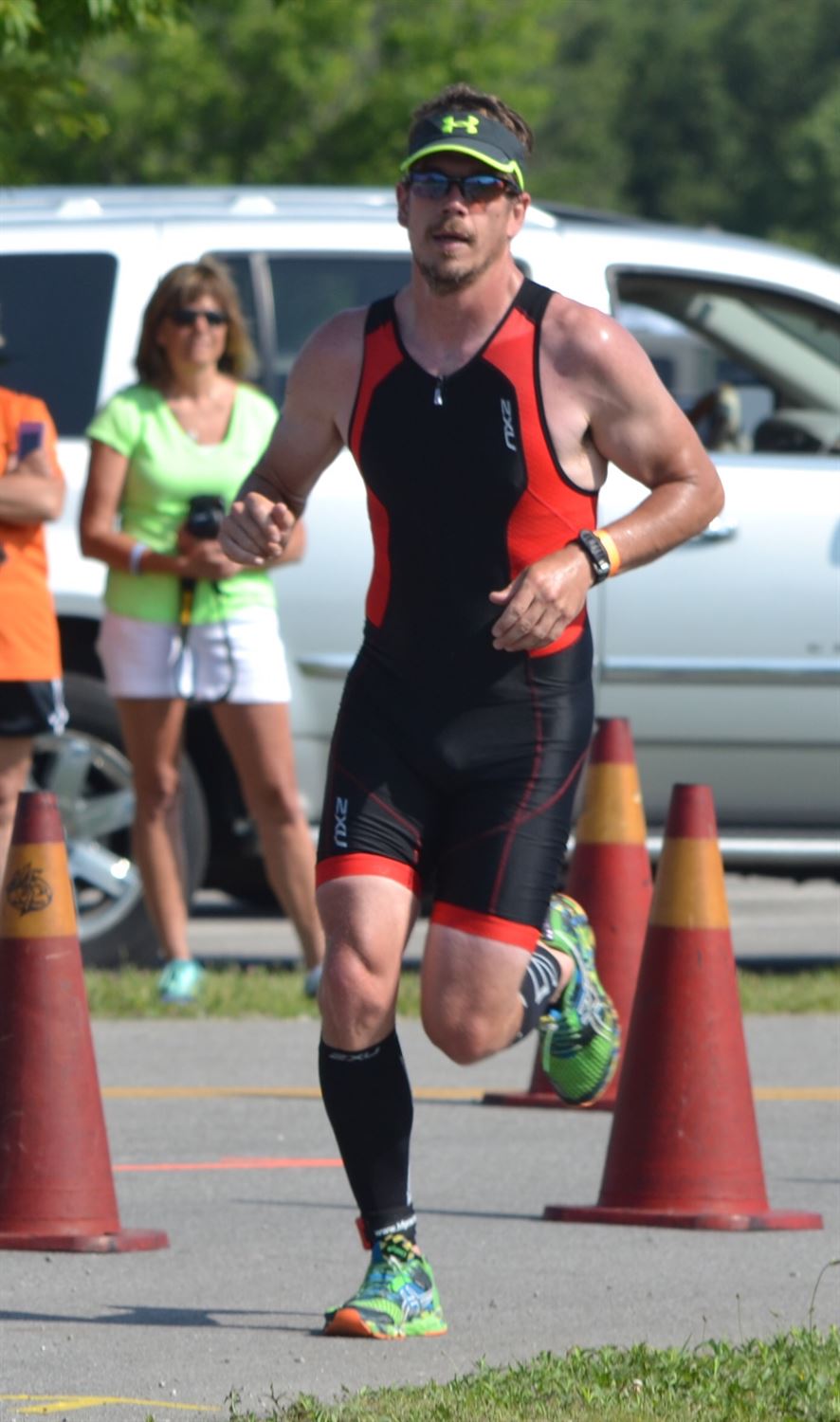 Comments: Oh my the bike was fun! I came out of transition feeling good, and quickly went into the big gears. Once out on the course I quickly found my HR was going through the roof as it was holding around 160! At the last race, I did better holding around 150 and kept trying to bring it down to there. What I didn't realize at the time was that I was going up a slight incline with the wind in my face, but with the adrenaline pumping I didn't realize it and my HR stayed high. Finally around the 5 mile mark my HR dropped to 155 and I decided to try and hold it there and see what happens. Of course at this point the road turned completely smooth, with the wind at my back and I found myself cruising along around 25mph. During this phase I was quickly passing other competitors. The next few miles were uneventful, and then came into the only hills of the course, and really wasn't sure if they were hills. Going into the 1st I knew I wanted to be aggressive, and kept the effort strong going down the hill and carried this through and up the next hill. I continued to cruise past other competitors and felt that I was quickly making up for my slow swim times. At the end of the 1st lap, you have to go almost into transition and do a tight turn around. During this I came up on a slower rider and had some difficulties getting around him, once clear though I quickly went back to full effort and headed back onto the course for lap #2. Lap 2 was for the most part uneventful, I had learned from the 1st lap that the 1st few miles were incline and by this time the wind had picked up even more, so I held my effort down as to try and avoid a blow-up. Best part of this lap was when I hit the back section where the road was smooth And the wind at my back. On this lap, I noticed my speed getting up to and over 27mph and surprisingly I held this up until I had to make the next right hand turn and even then was able to hold a pretty solid effort. At the end of this section I found myself a little distracted and thought I had eased up on intensity, my HR for he 1st time had dropped below 150 and was down around 145. I refocused and continued on, into the hills and past several more riders. Even at this point I didn't realize how strong of a ride I was having, coming back into the park I again came up on other riders. They seemed to be sitting up and slowing into transition but we were still a good 1/4 mile out so I went around and finished out the ride. Lap Data (5 miles each) 1: 14:56 (AVG HR 159) 2: 12:33 (AVG HR 154) 3: 15:18 (AVG HR 156) 4: 13:34 (AVG HR (152) 5: 13:30 (4.77 miles) (AVG HR 153) Bike Nutrition: 1 3 scoop bottle of infinit. Probably about 420 calories What would you do differently?: Absolutely nothing, I found the gas pedal and pushed the entire time. Probably could have pulled back a bit more to save some energy for the run but wheres the fun in that. Having the fastest bike split of the AG is a great feeling. ![]() Transition 2