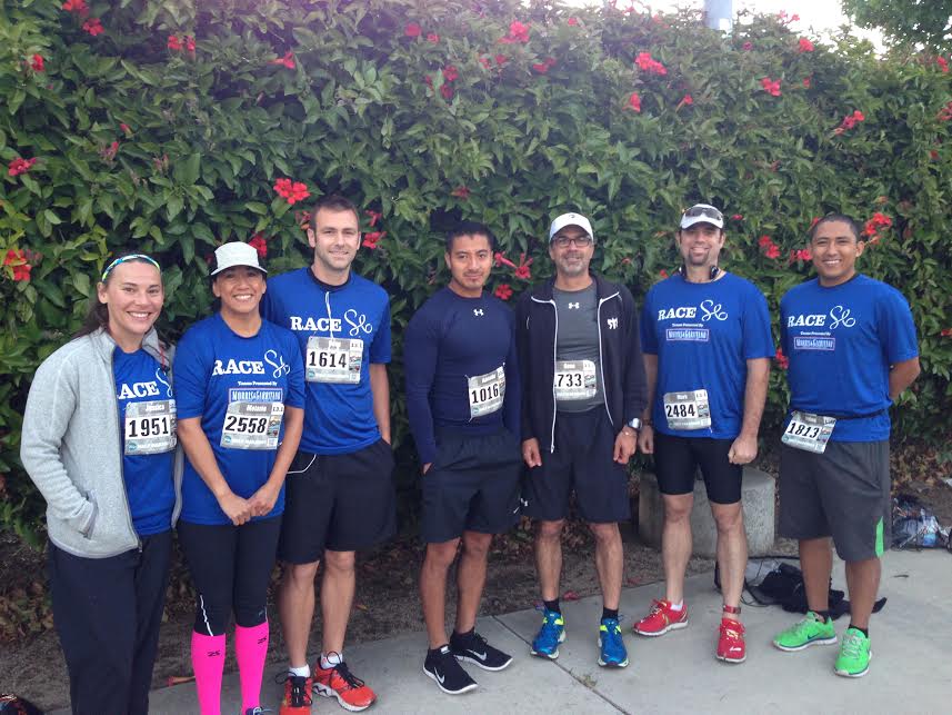 Woke up bright and early and started to get ready. My right foot was a tight due to lingering plantar fasciitus, fortunately the pain factor was very low. Got picked up by one of my tEEm members, dropped off near the starting line, and found the rest of the tEEm for a pre-race photo. It was the first HM for a couple of them and they were feeling excited and ready due to our team training runs.