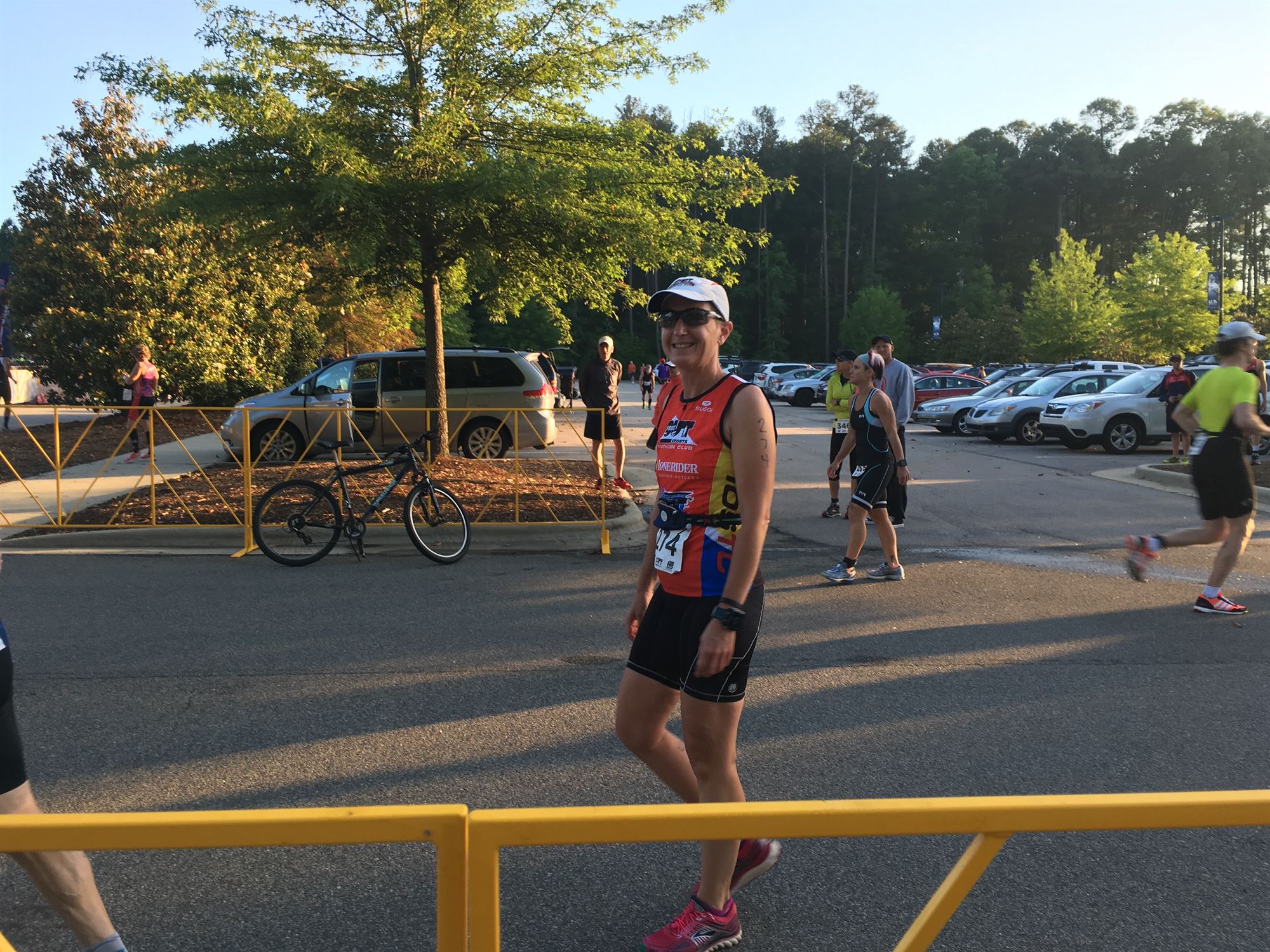 Comments: They played the national anthem and lined up the long course men. The men started right on time at 7:00 and they lined up the women. We started at 7:04. The short course athletes were starting later. I ran a lap of the USA Baseball parking area and headed out on Green Hope School Road before getting on the greenway. We crossed Morrisville Parkway and passed the first water stop (also the short course turnaround). By the time we got to the first water stop, I started to pass some of the men. We continued on Southbridge Greenway which had some notable hills. At the turnaround, I grabbed water and headed back the way we came. I passed people walking the hills. As I got back to Green Hope School road, I could see people starting the bike course and I hustled back to transition. ![]() Transition 1