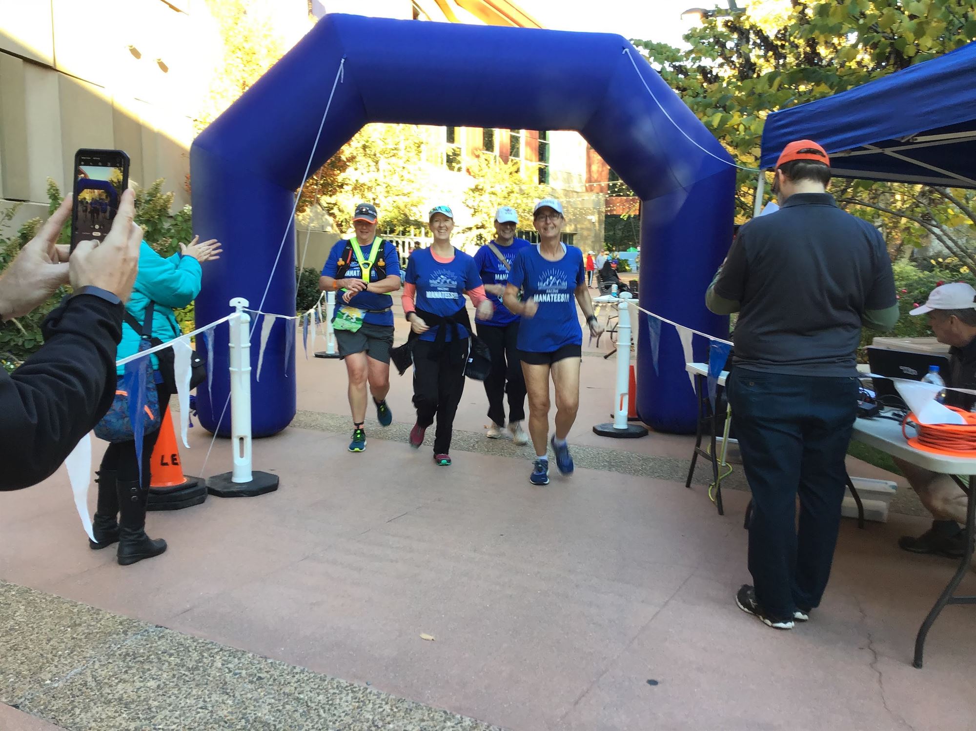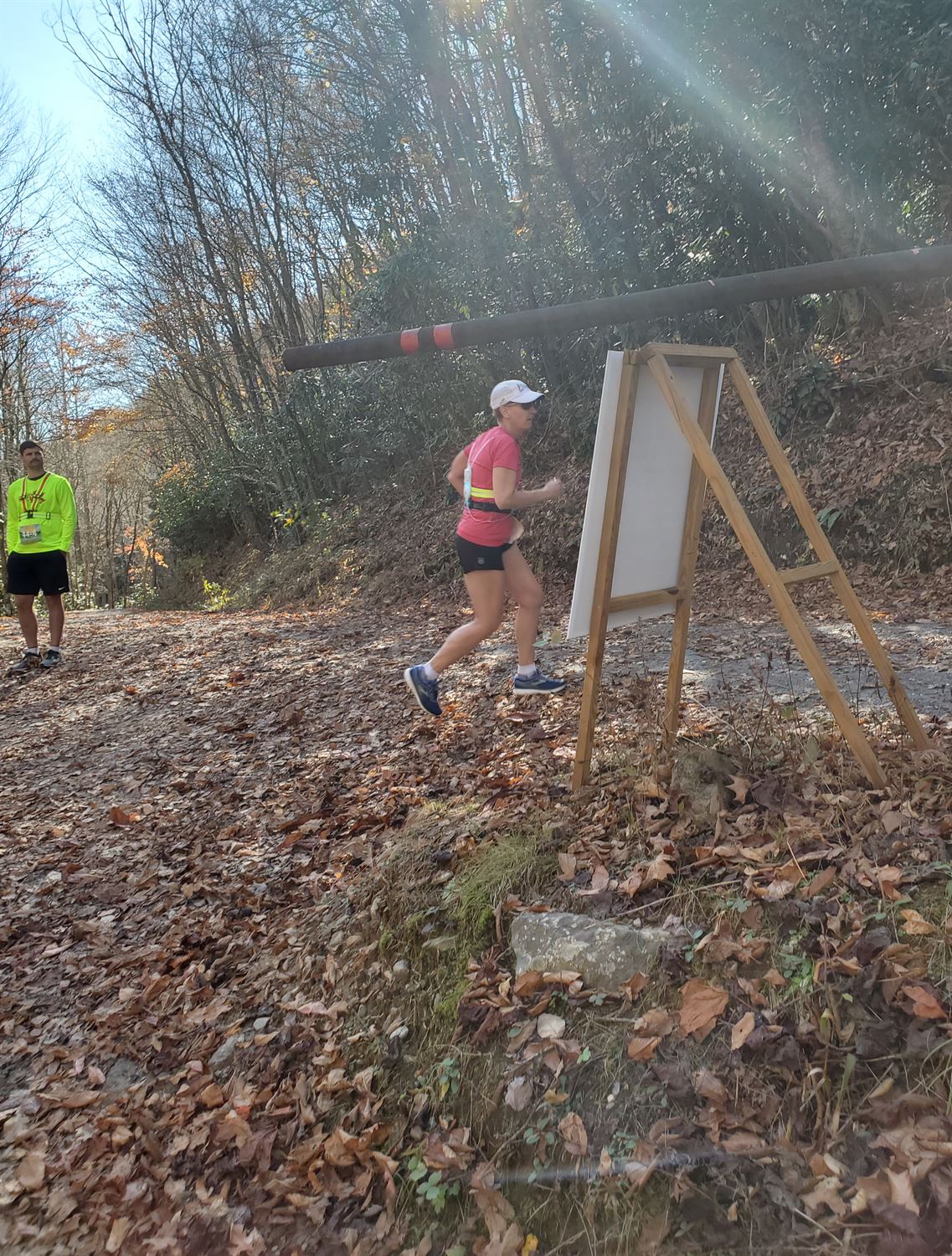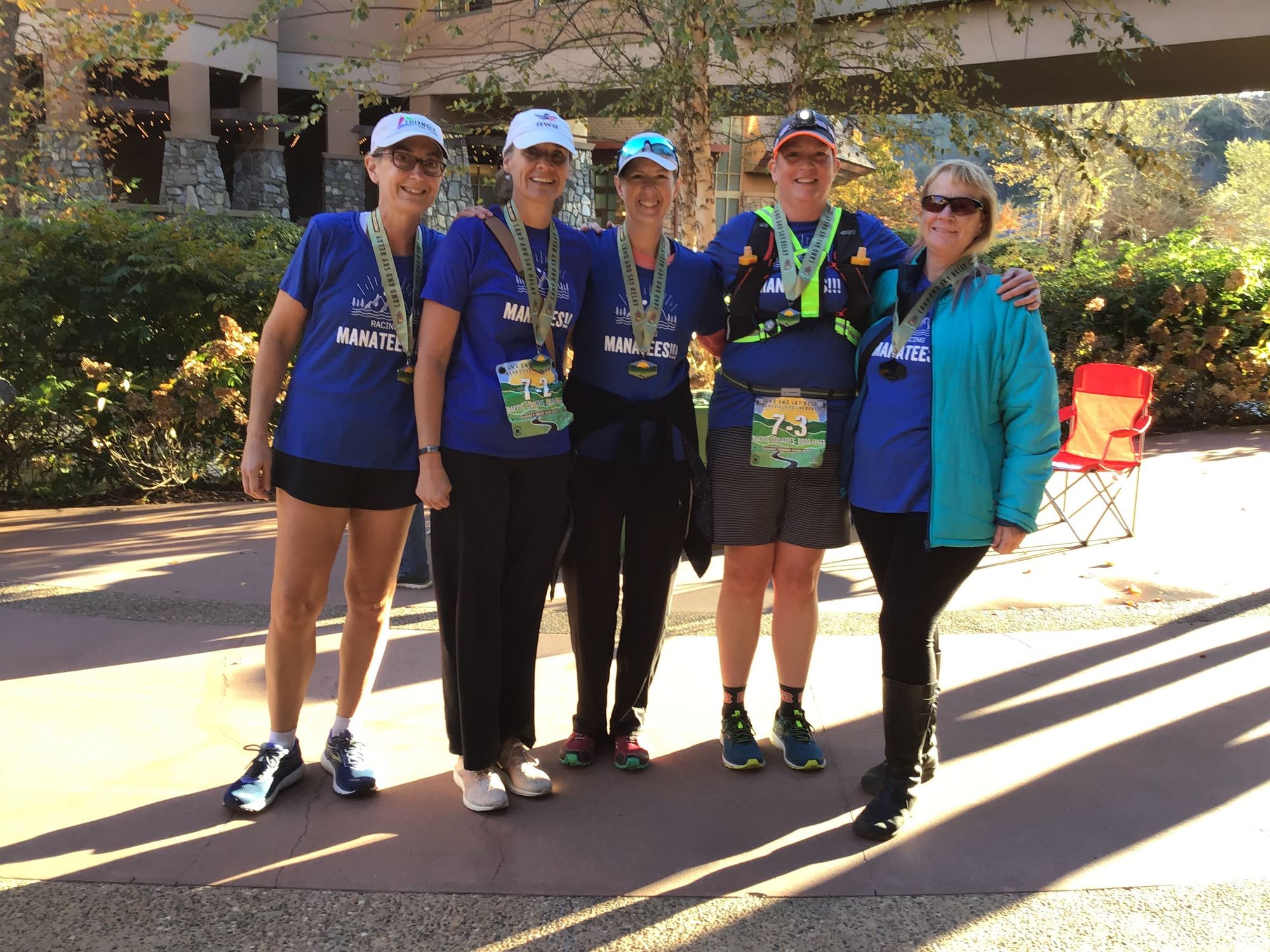 Comments: Friday Kevin and I drove to Asheville on Friday morning. We had lunch and then Kevin rode his mountain bike in Bent Creek while I sat at a coffee shop and read a book. I also walked over to Brueggars to get bagels for Saturday since we had such an early start. When Kevin was done with his ride, we were able to check into our hotel. Then we went to packet pickup. While all of this was going on, Robin coordinate a Manatee Meetup at The Cantina Fresh Mex and Tequila Bar. It was so close to our hotel that we were able to walk. Anyway, we met the team for dinner. I was able to distribute the race bibs and t-shirts while we were there. After dinner we walked back to the hotel and then... Early to bed... How Did the Race Unfold? 4:00 wake up call Breakfast of bagel with PB, cold brew, water with Nuun We left the hotel at 4:30 to get to the starting area Weather: Foggy and 29 degrees at the start I had on sweatpants, a winter coat over my running gear and realized that I had forgotten to pack gloves :-/ Time went pretty quickly. Ann-Marie’s team, the Jackwagons, were in the 5:00 group and we saw them off. Loaded Mary, Melanie, and TJ’s overnight bags into Kevin’s car and Janyne’s race bag into Robin’s car. Kevin asked if it was only women doing this thing. I said no. Then a team a guys showed up to prove me right. We primed our chalk marker and added some decorations to the car. TJ was our first runner. We saw her off, Kevin took some pictures, and then Robin chauffeured us to our first exchange point while Kevin went back to the hotel to warm up and get some breakfast. I had the second leg. The exchange with TJ went fine. It was dark. Of course it was dark! It was 6:30 in the morning and foggy. I had on my Noxgear vest and super bright headlamp over running tights, long sleeved tee and running vest. This leg was 4.5 rolling hills with about 375 feet of elevation. The run was relatively uneventful. I was running with someone much of the time and we kept on swapping off the lead position. At one point, she started to make a turn. I yelled out that we went straight. She corrected and we made it to the exchange point without incident -- or extra miles. I got to the exchange points and saw no Manatees so I yelled out. I pretty much embarrassed myself by yelling out at my exchanges for the rest of the day. I handed off to Melanie for leg 3. Mary’s first leg (leg 4). This is where we really broke out the chalk marker. We did some serious tagging in the parking lot with the horses and again at the park in Clyde. This was a long leg with 3.5 miles of uphill. When Mary got in, she handed off to TJ for leg 5 and we headed for Starbucks. But wait, we cannot see the runners very well due to the fog, which seemed to get denser as we were driving. We decided to make a U-turn and find TJ to give her a headlamp to increase her visibility. Then we went to Starbucks that was actually in an Ingles grocery store. I placed our Starbucks order while Robin put gas in the car and Mary changed clothes (actual bathroom with flush toilets!). Then Mary and Melanie bought a bunch of olives from the olive bar. I never did find out what happened to them. We proceeded to the next exchange point in Clyde and became increasingly brazen with our tagging. TJ handed off to Mary for Leg 6. We tried to drive to the next exchange but got caught up in a one way street situation. We backtracked slightly and made our way to the next exchange point (indoor bathrooms!) without further incident. The sun was finally burning off all the fog and it was finally started to get warner. I had the Leg 7 which was Lake Junaluska to Maggie Valley - sun came out after my time to change clothes had passed so I was overdressed. This was listed as a “pretty easy leg” at 6.2 miles and 470 of gradual uphill. The first part was in on US19 in traffic and on sidewalks. There were a million cones so I felt safe but it was noisy. I was glad when we turned onto a quieter street after the first three miles. On Moody Farm Road, the course went along a creek. After about 2 miles the course merged back onto the sidewalk along US19. Handoff to Melanie for Leg 8. After let 7, I was hungry and thirsty. Had lunch (bagel with PB, banana, water with Nuun) About this time, I texted Kevin with our beer order which became a beer and wine and hard cider order. (!) Kevin had offered to buy post race beer. He was surprised when I texted him, “Beer (2), non IPA. Red wine (1), possibly a hard cider.” He managed to buy everything on sale and get North Carolina beer and hard cider. He knew better than to get North Carolina wine. haha! Mel handed off to Mary for Leg 9, through Soco Gap -- dangerous half mile section between Blue Ridge Parkway underpass and the exchange point. TJ had the next section, leg 10. This was billed as the prettiest leg. It was also something like a mile longer than advertised. The car had a separate route from the runners (gravel, steam crossing) to the transfer point. The car parking was .8 miles from the transfer point so we parked and hiked up to to meet TJ. Robin brought a town for TJ and I brought a blanket in case she got cold on the way back to the car. About the time that TJ got to the water crossing, a rented Ford Transit 12-passenger van appeared on the dirt road on the opposite side of the creek from us. Apparently, this team did not notice that the driving route was different route from the run route! The stream was roughly knee deep. I’m not sure that I’d want to take my rented van through that! I met TJ at the creek crossing and walked the last 50 yards or so to the official exchange point to check in and begin Leg 11. Leg 11 was mostly on gravel road and started with a 1.5 mile hike, a half mile downhill, and then another half mile hike. During the first 2.5 miles, I gained 1100 feet, much of it pretty steep. Then I had a five mile downhill. The first mile or so of downhill had a lot of dead leaves on it. It 