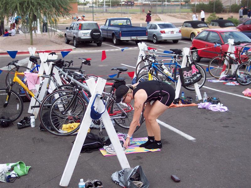 Comments: So here's my first "racers brain" mishap. You know...where your brain starts to get mushy and you don't always think straight...like forgetting to take your helmet off as you start on the run? Well, my coach told me to tuck my swim cap into my suit so I could adjust my pony tail as I am running out of the pool. (Have to move it down for the bike helmet.) So I have no waist band in my new one piece suit, so I sort of tuck it in my neck hole. Well, as I go through everything in T1, I forget to remove the swim cap. (Stay tuned to find out when I finally realize this!) What would you do differently?: Um....remove the swim cap from my neck hole!!! Otherwise it went well. Clipped in easily, and was on my way. ![]() Bike